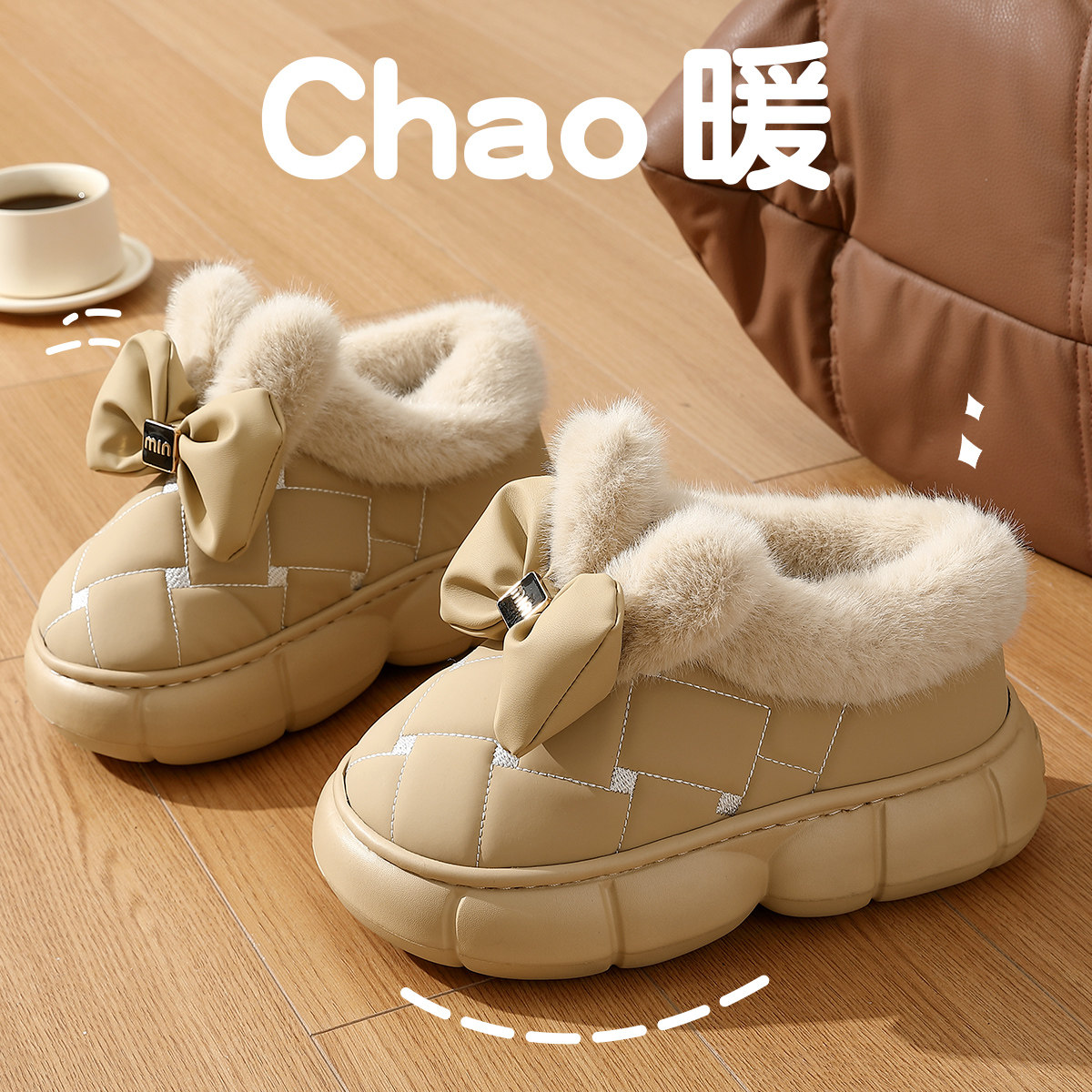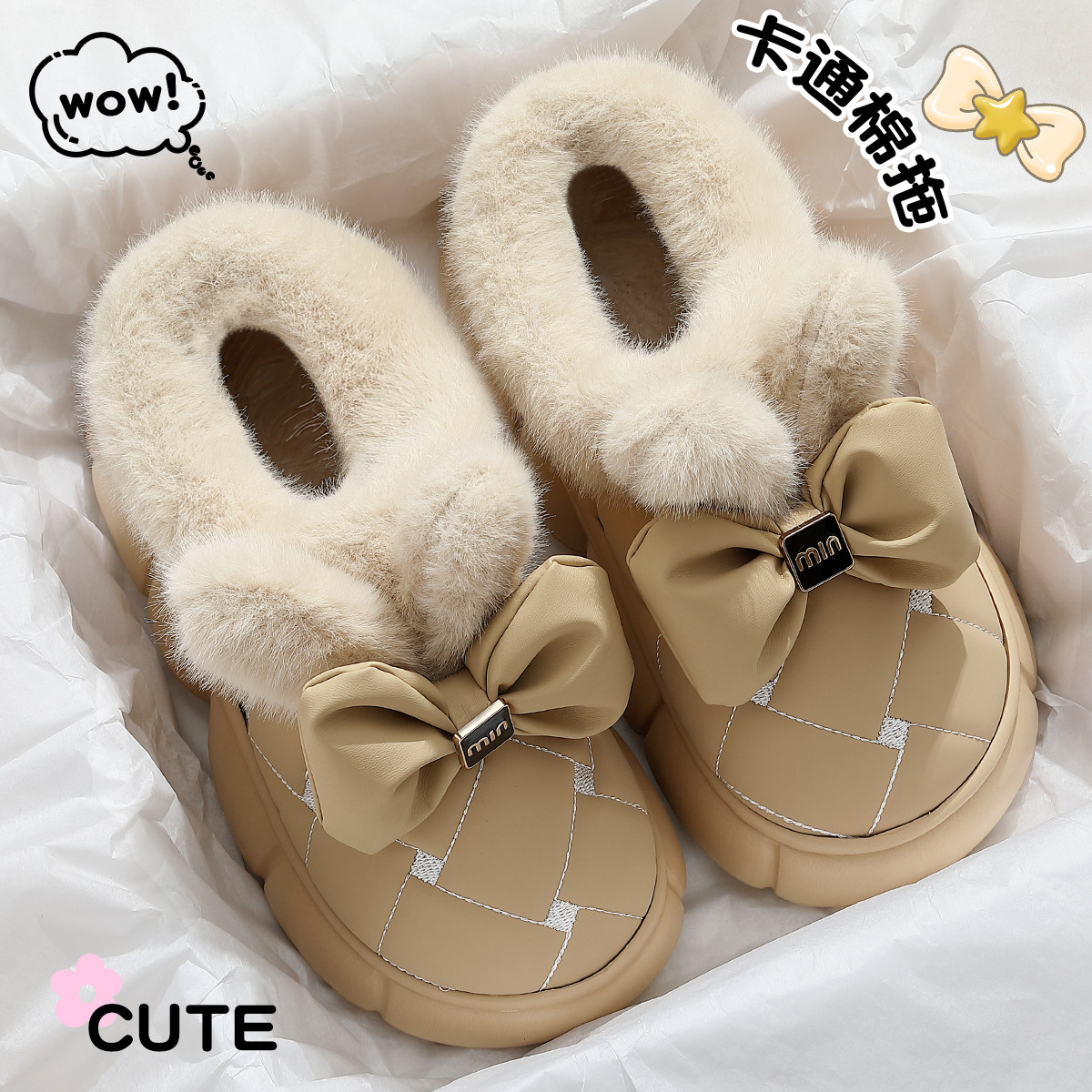 蝴蝶结棉鞋女士冬季2025新款可爱高包跟厚底加绒保暖外穿棉拖鞋女