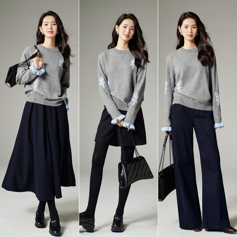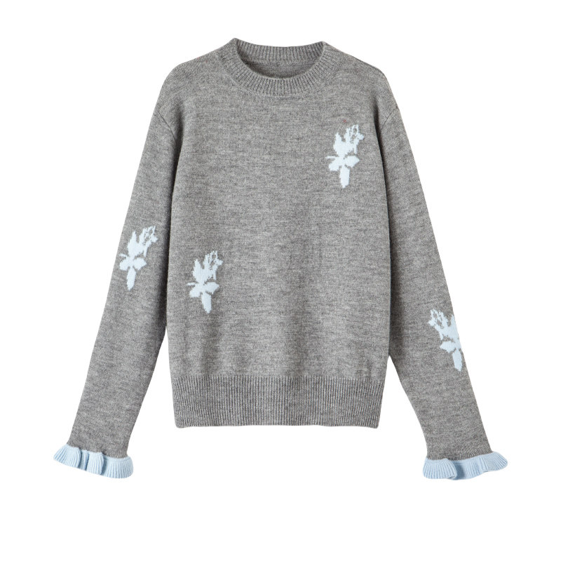 晚白2026年春新款圆领气质撞色印花独特大码格雷灰上衣针织衫女