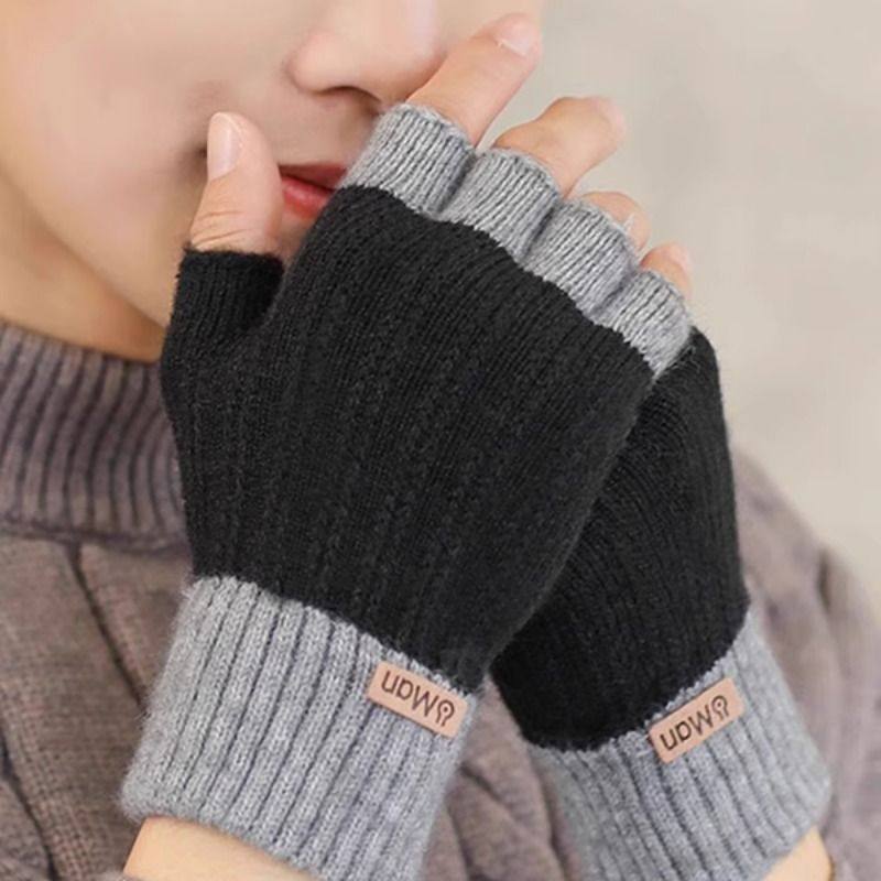 半指手套男士冬天保暖加绒加厚针织毛线露指学生写字骑行秋冬季男