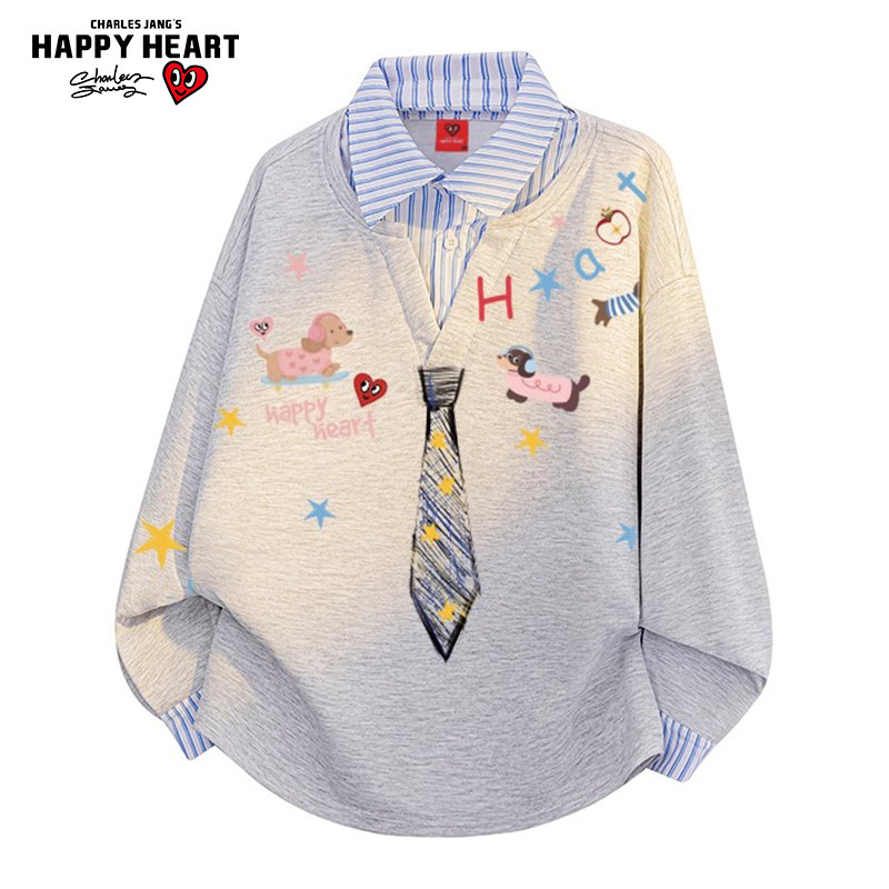 查尔斯桃心涂鸦领带假两件衬衫领卫衣男女秋冬季情侣宽松休闲上衣