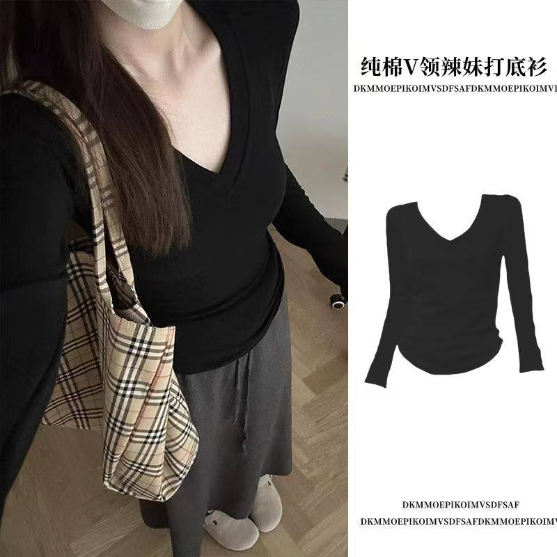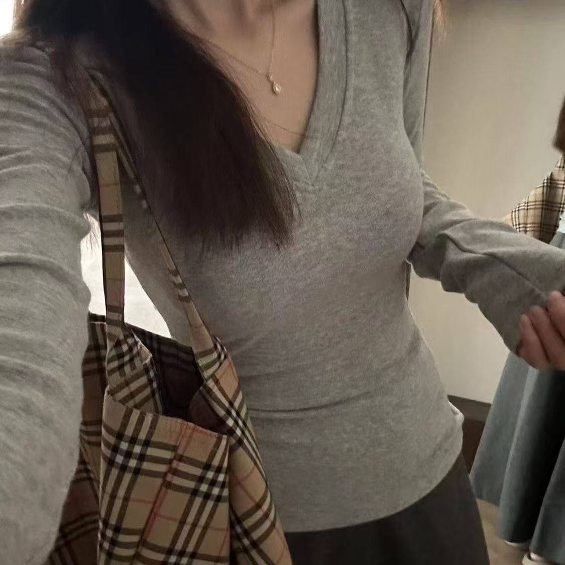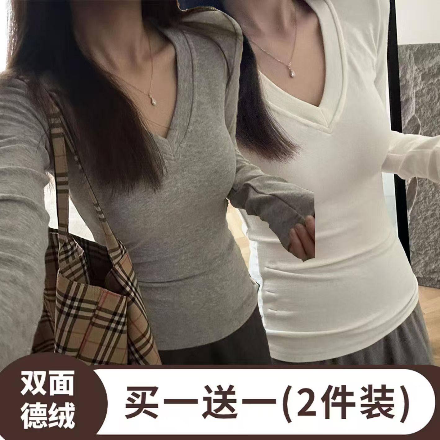 秋冬新款正肩V领长袖T恤女德绒设计保暖加绒减龄上衣服G白色黑色