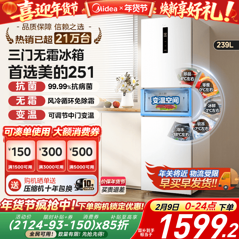 美的251超薄三开门家用小户型宿舍一级节能省电冰箱风冷无霜