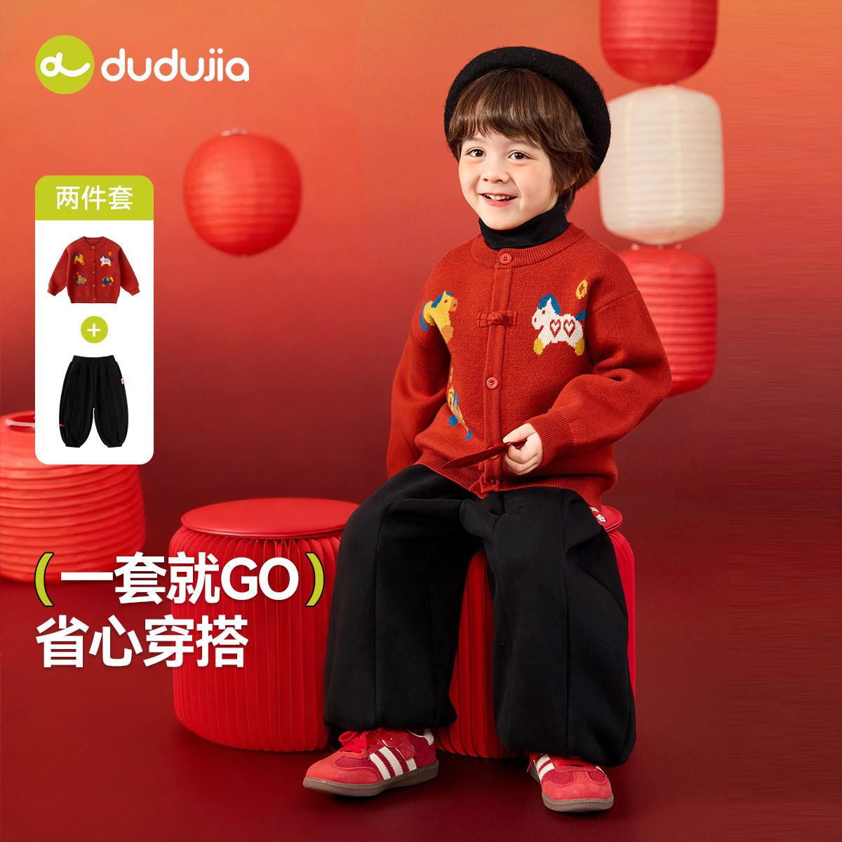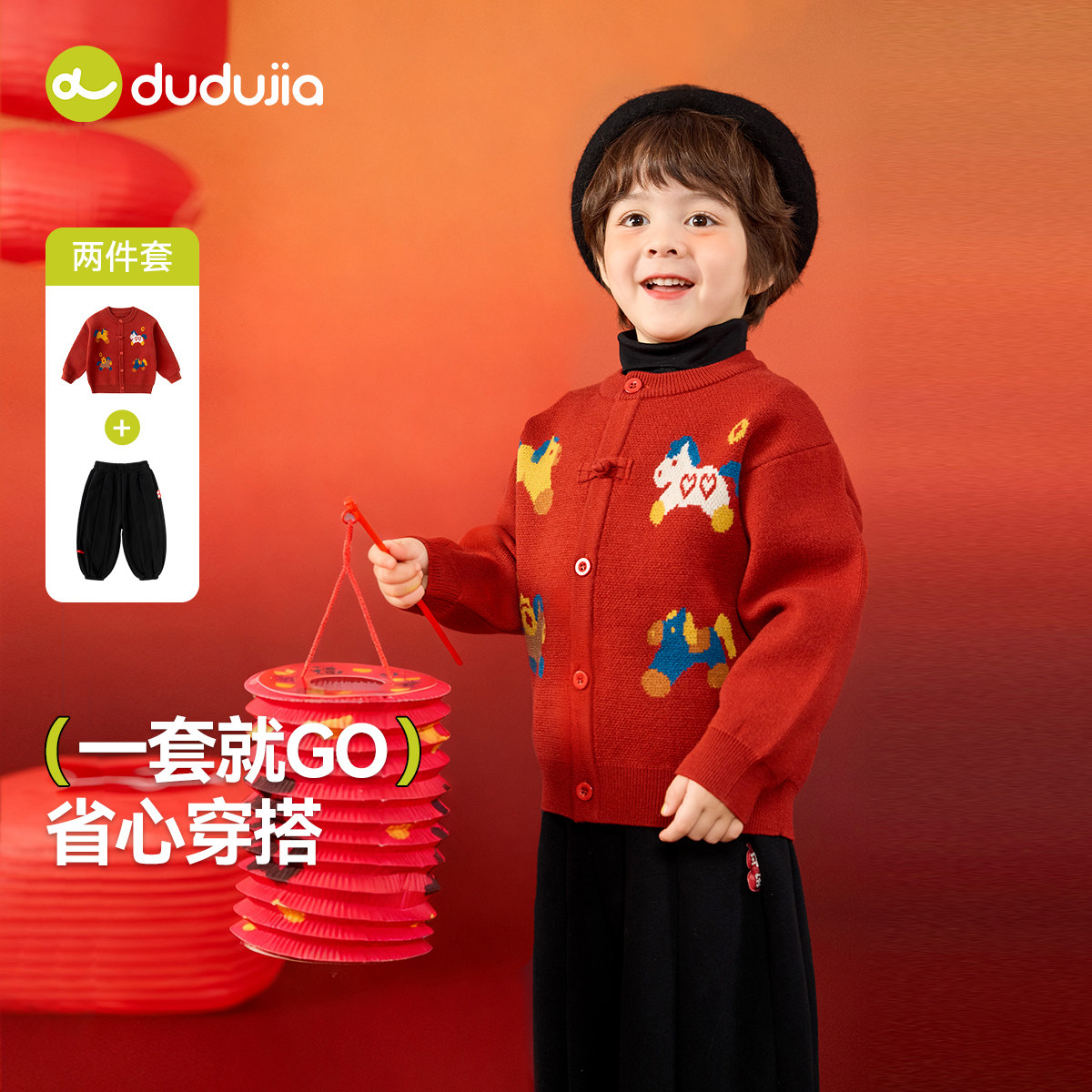 嘟嘟家男童唐装冬季女童新年装宝宝拜年服红色毛衣裤子儿童毛线衣