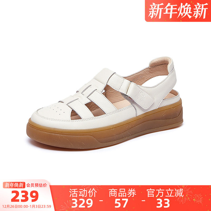 骆驼女鞋夏季新款镂空包头罗马凉鞋女厚底猪笼鞋真皮妈妈鞋
