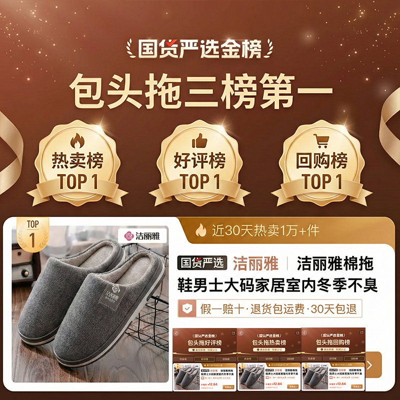 洁丽雅棉拖鞋男士大码家居室内冬季不臭脚2025新款保暖防滑拖鞋女