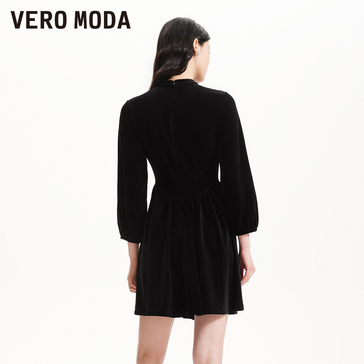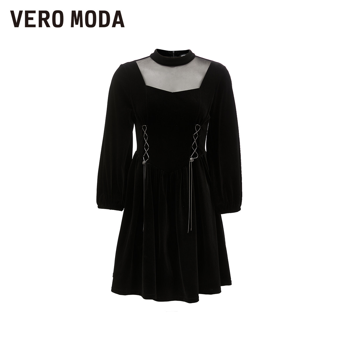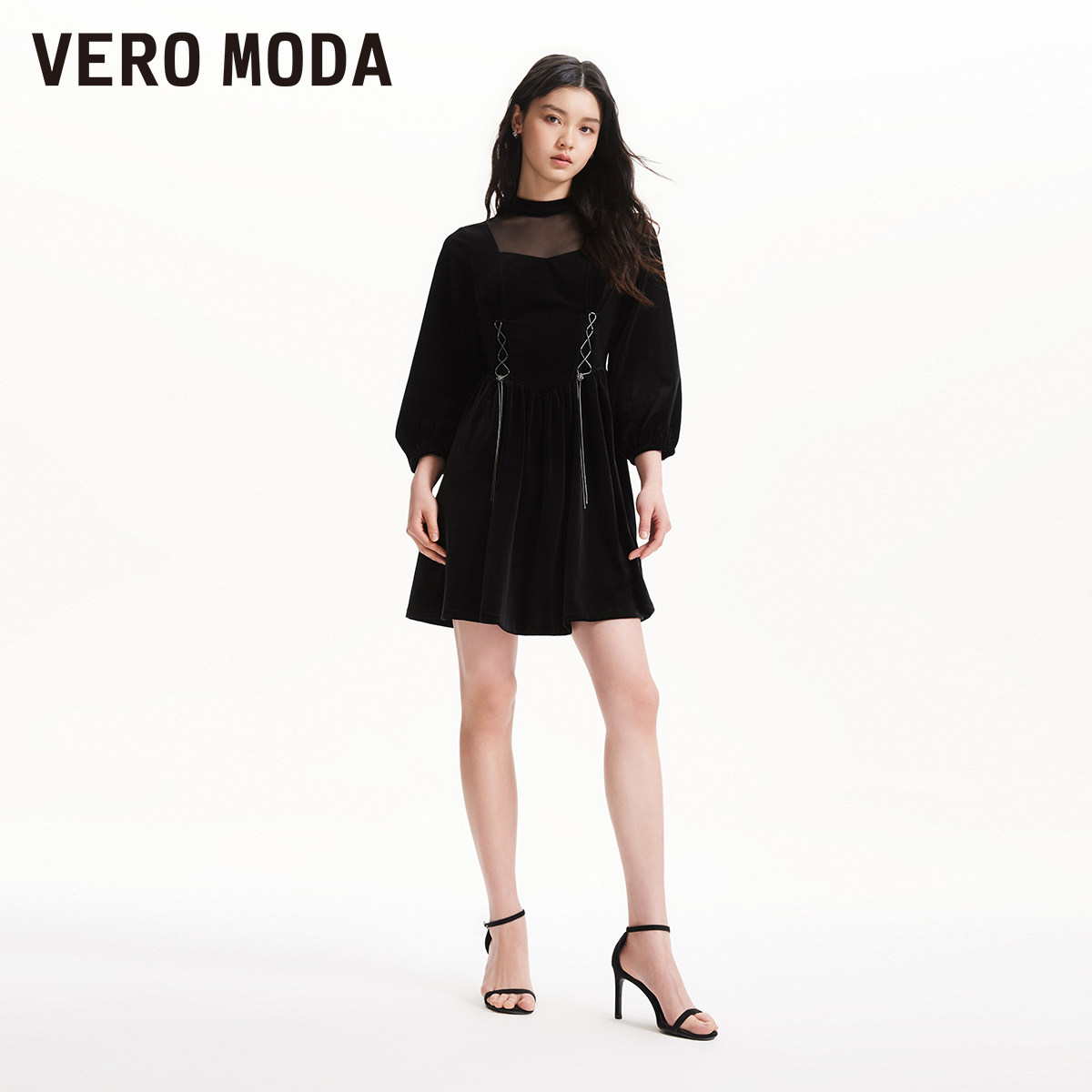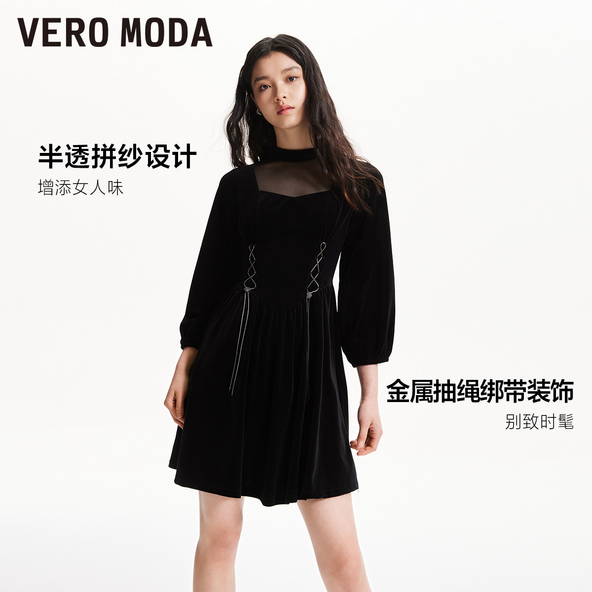 Vero Moda奥莱连衣裙秋季新款优雅气质半透拼纱七分袖短裙子流行