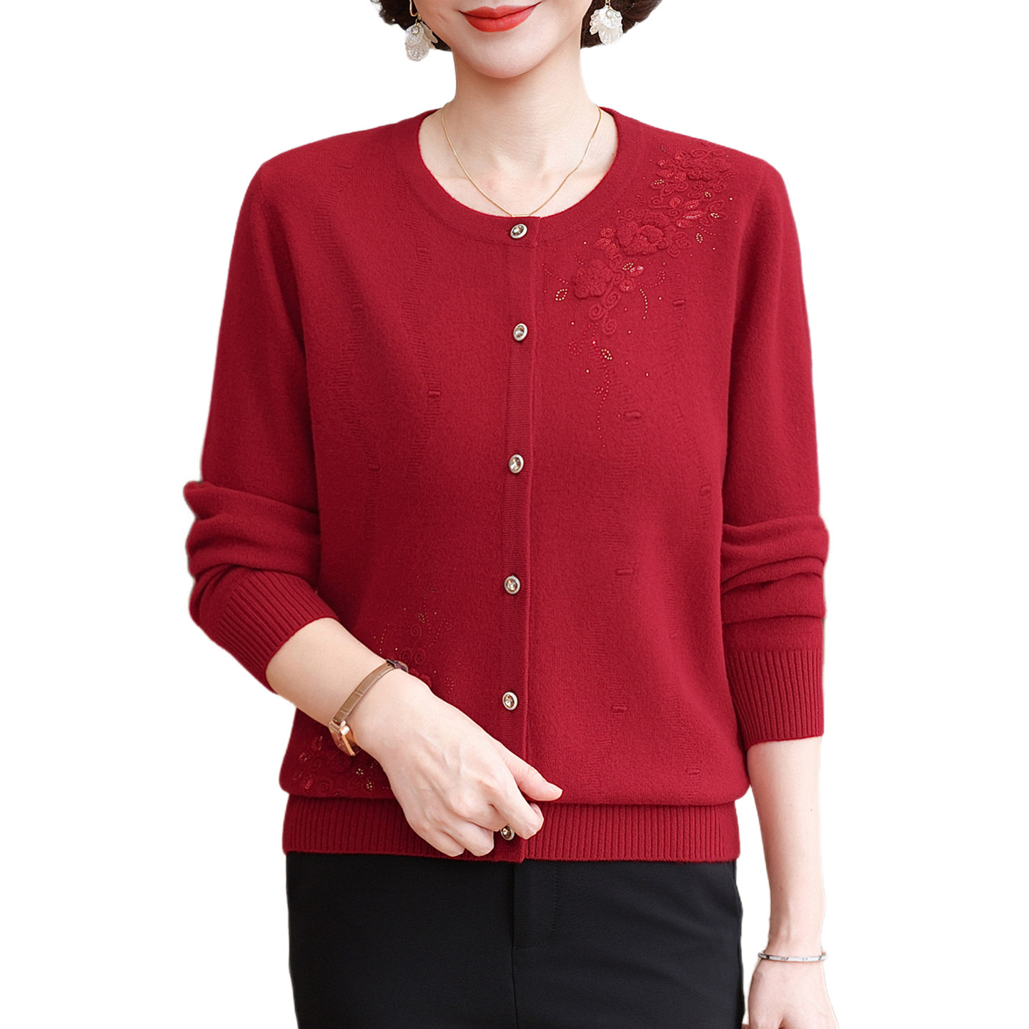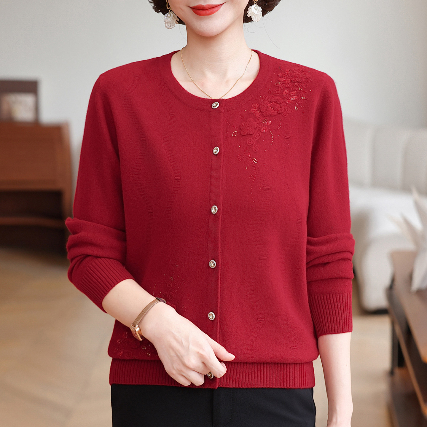 恒源祥新品100%绵羊毛衫秋冬装开衫中老年女装针织衫上衣宽松毛衣