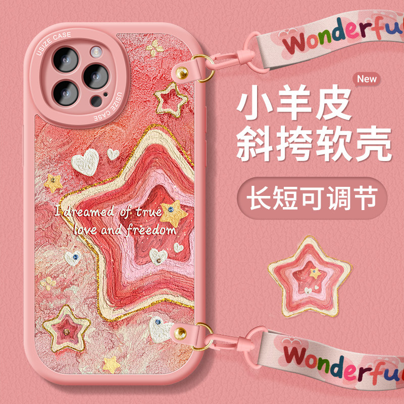 浮雕星星适用苹果16手机壳13pro新款女iPhone15proMAX全包8p防摔12mini竖挎xs挂绳7plus斜跨6s斜挎挂脖xr背带