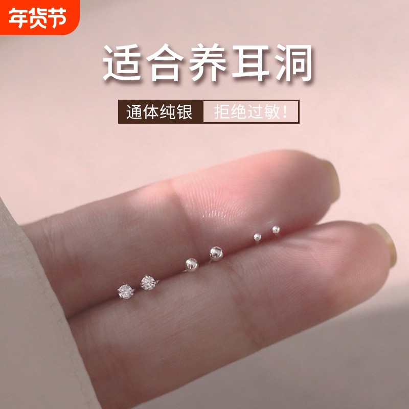 999纯银耳钉女养耳洞耳骨钉小众高级感锆石耳蜗钉水钻耳环银耳饰