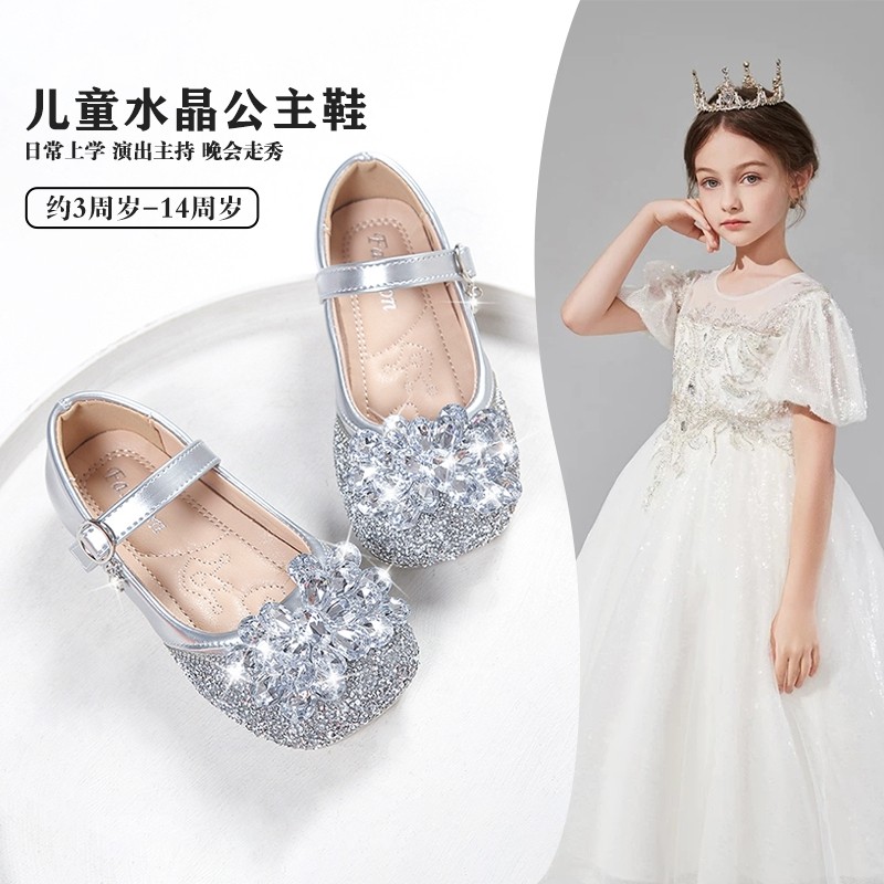 女童公主鞋爱莎儿童水晶鞋春秋新款女孩软底水钻小皮鞋演出配礼服