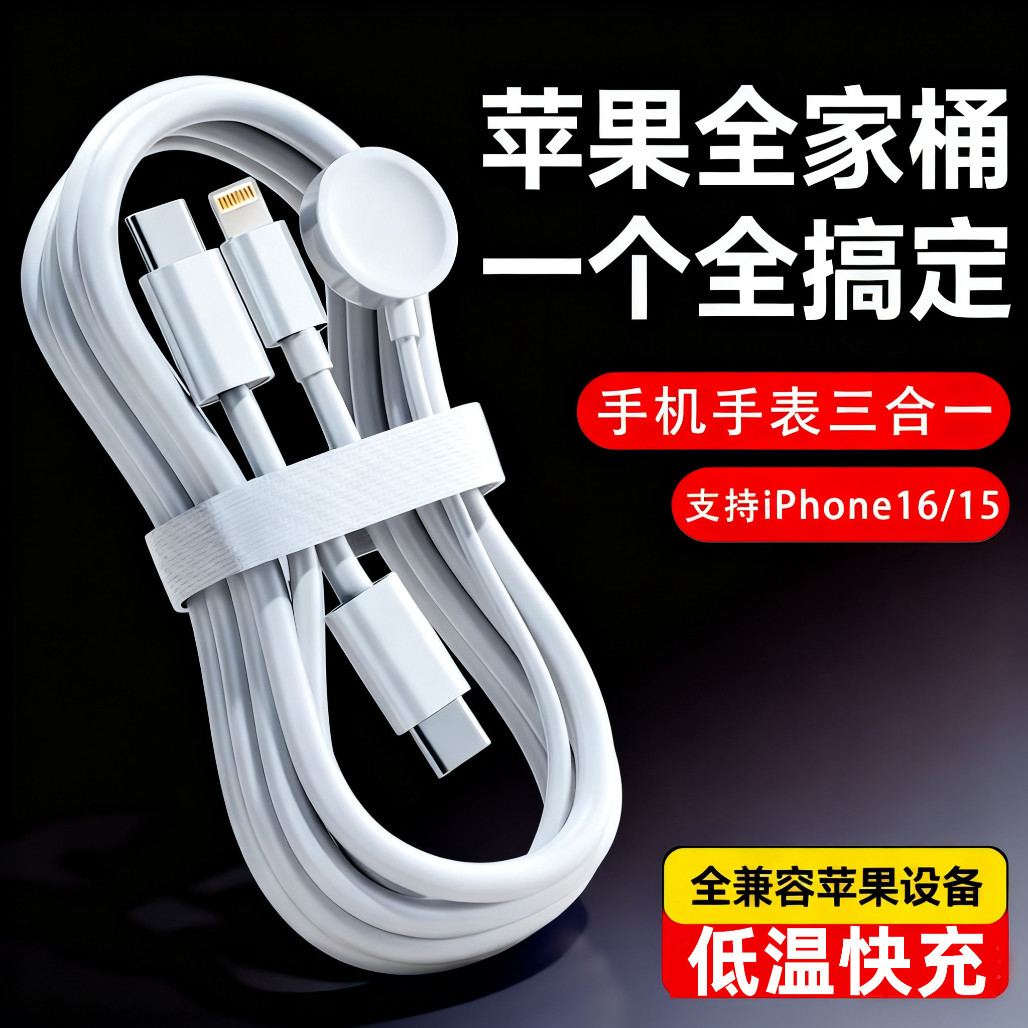 适用Apple Watch磁吸充电线5W快充无线充电器智能手表充电底座苹果手表三合一数据线iWatch一拖三 S10S9Ultra
