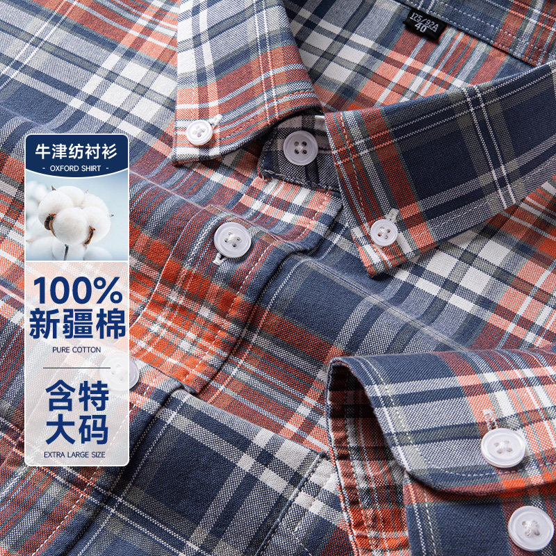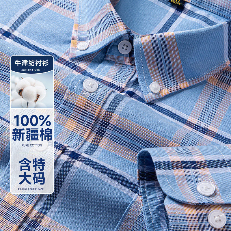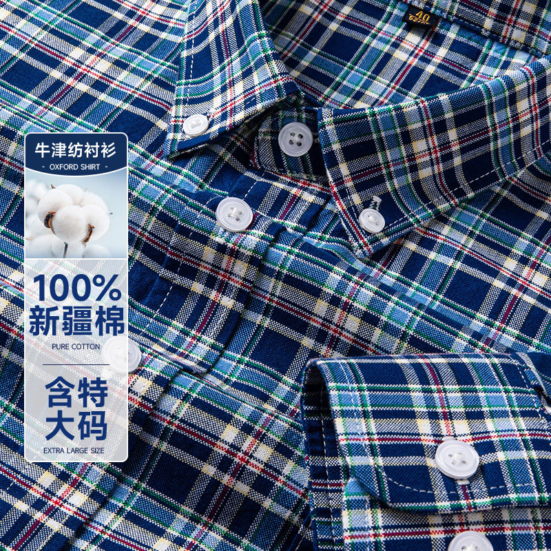 啄木鸟秋季男士长袖格子纯棉衬衫青年休闲牛津纺衬衣有加肥加大码