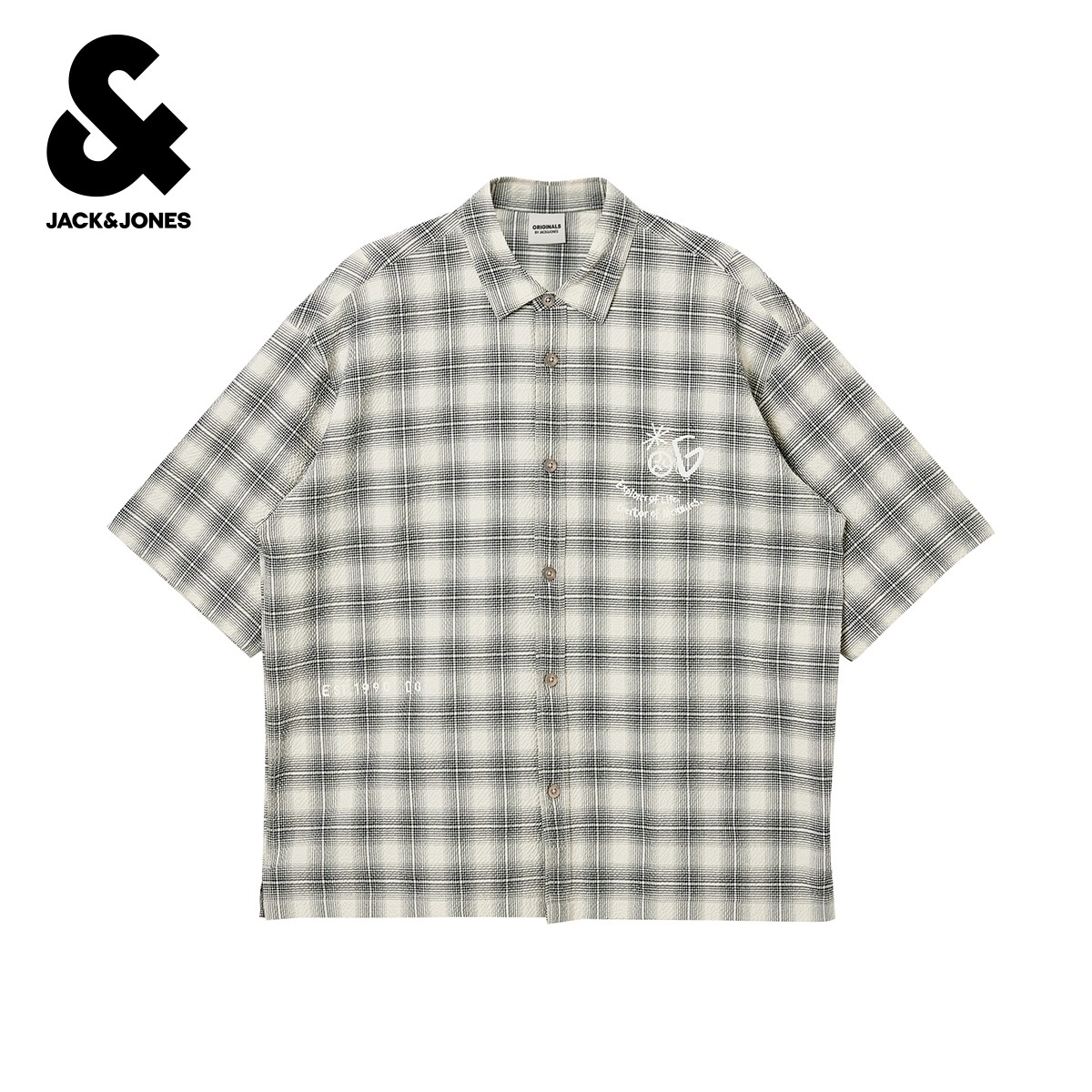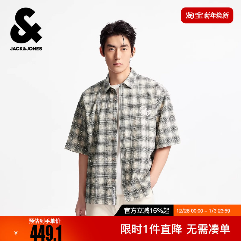 杰克琼斯男装冬新款胸前刺绣logo皮标宽松休闲翻领短袖衬衫