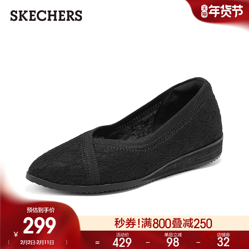 斯凯奇2026年春季新款女士蕾丝休闲坡跟鞋优雅舒适厚底浅口单鞋