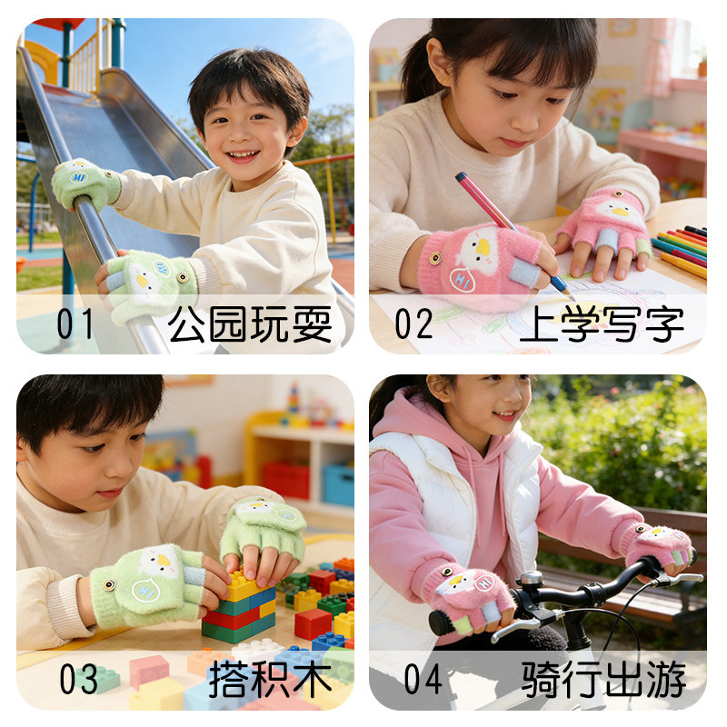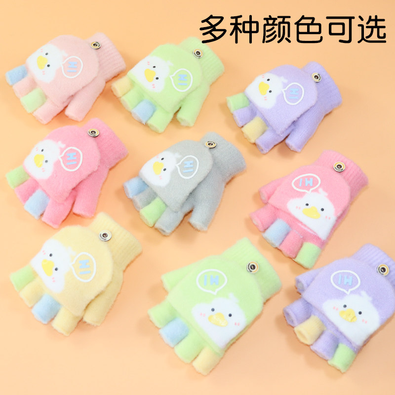 新款宝宝保暖手套小鸡仔冬季防寒五指加厚可爱男女童半指翻盖写字