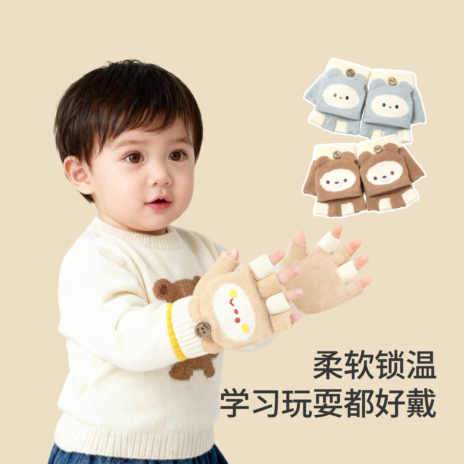 宝宝手套2岁女儿童翻盖包指毛线保暖男童冬天婴幼儿加厚半指户外