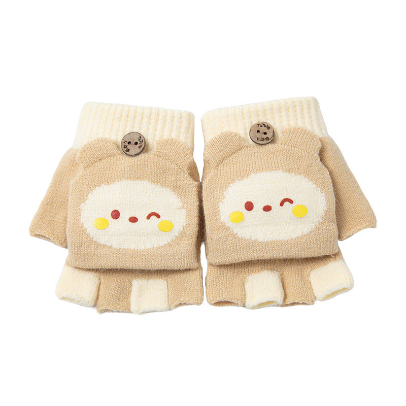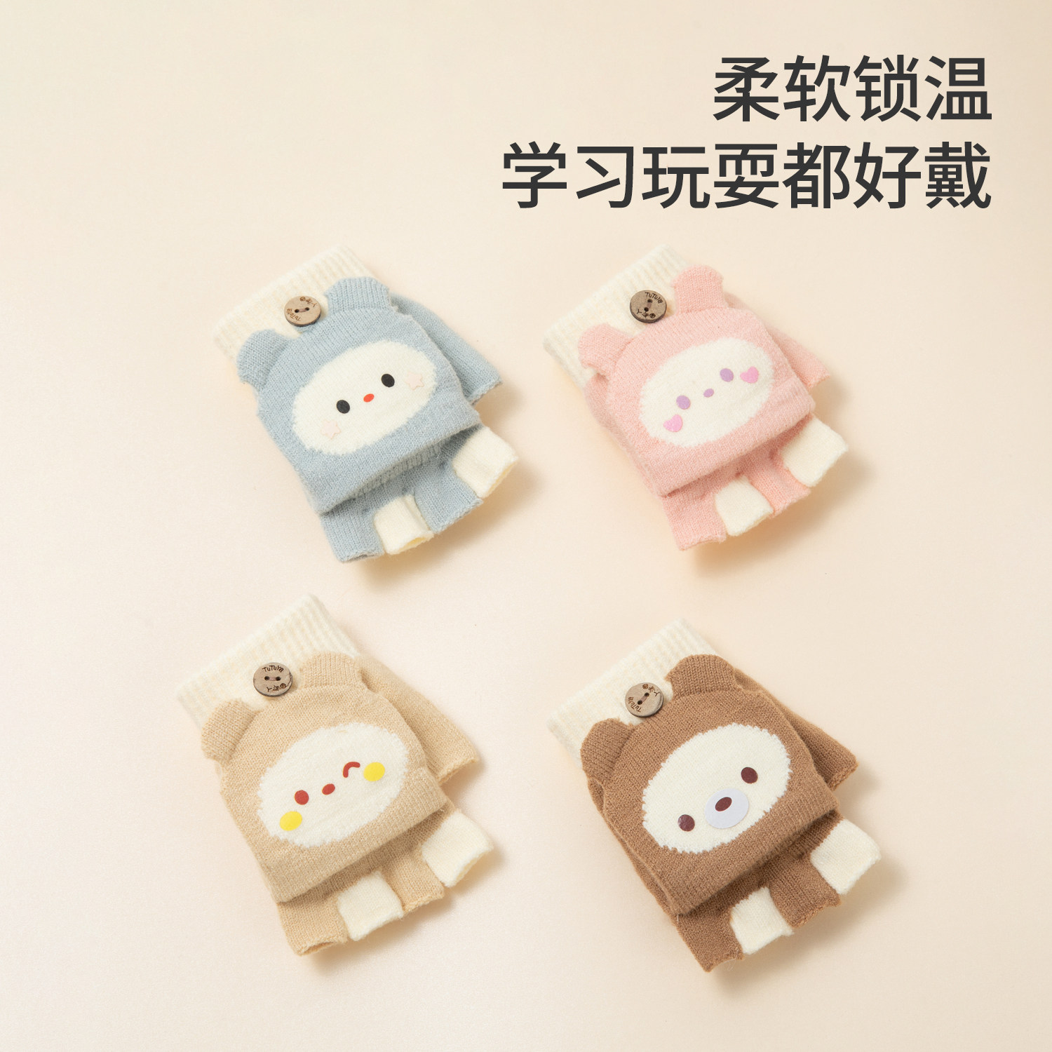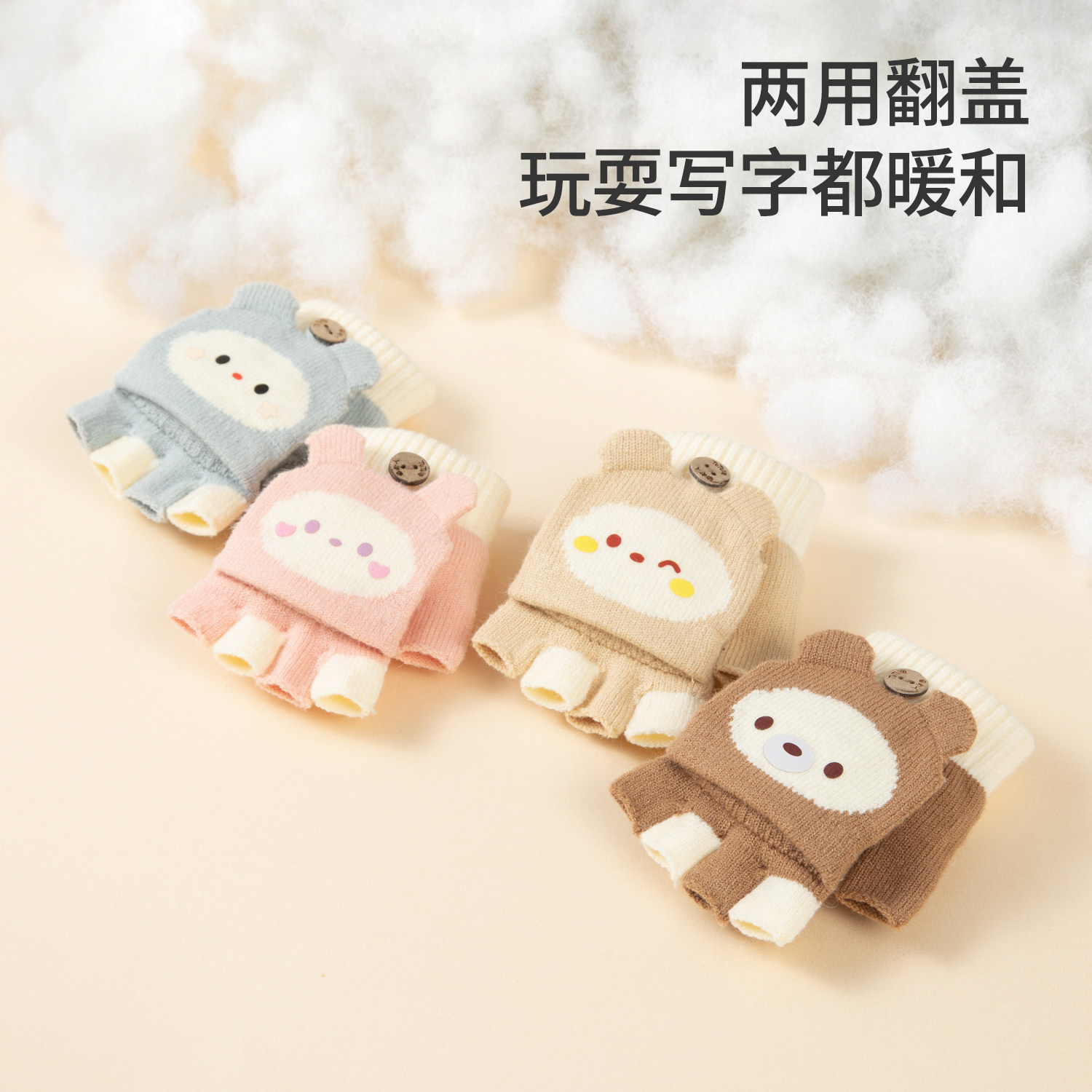 儿童手套半指翻盖冬天季保暖毛绒小学生女孩男童宝宝可爱露指写字