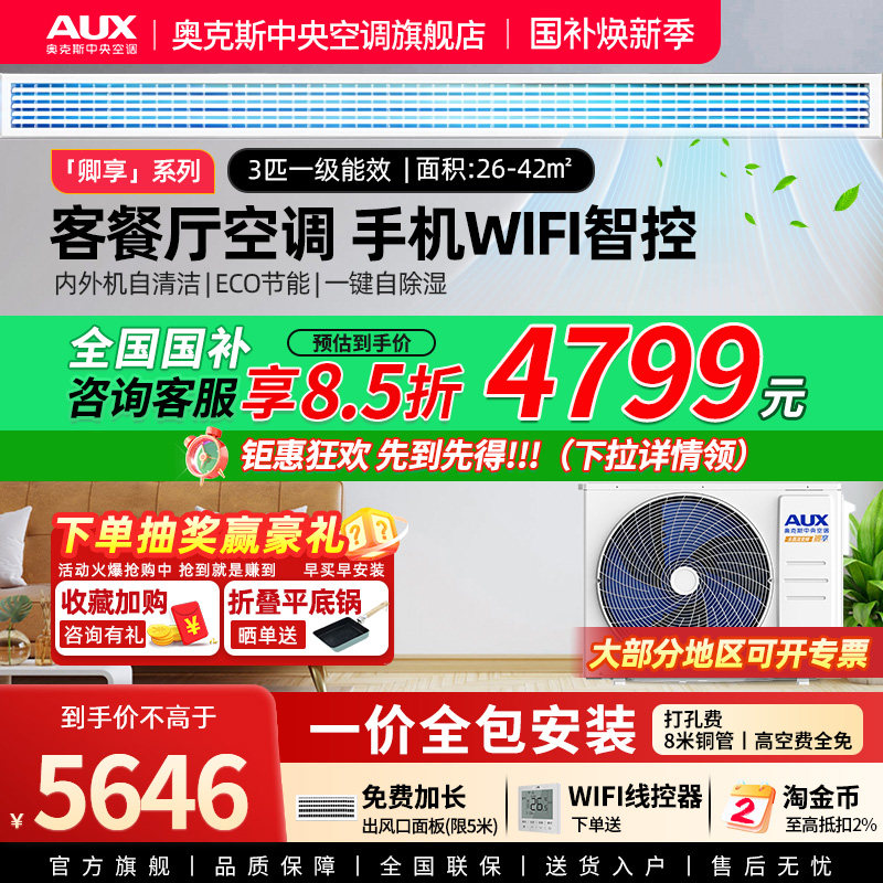 【新品】奥克斯3匹全直流一级风管机变频家用中央空调一拖一客厅