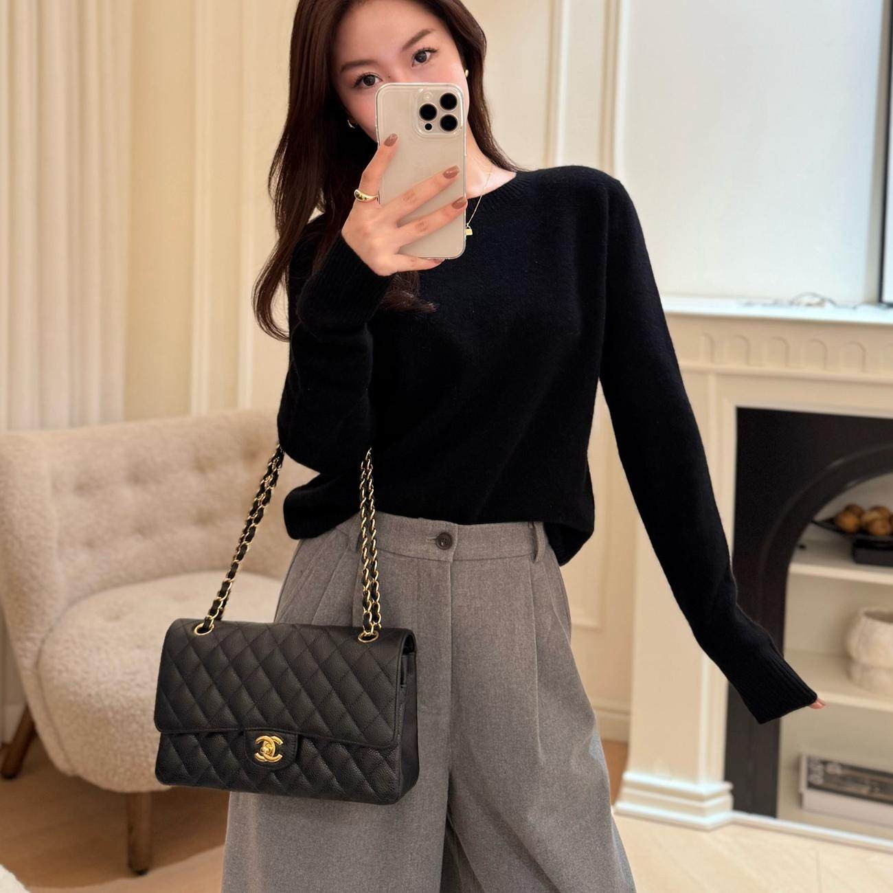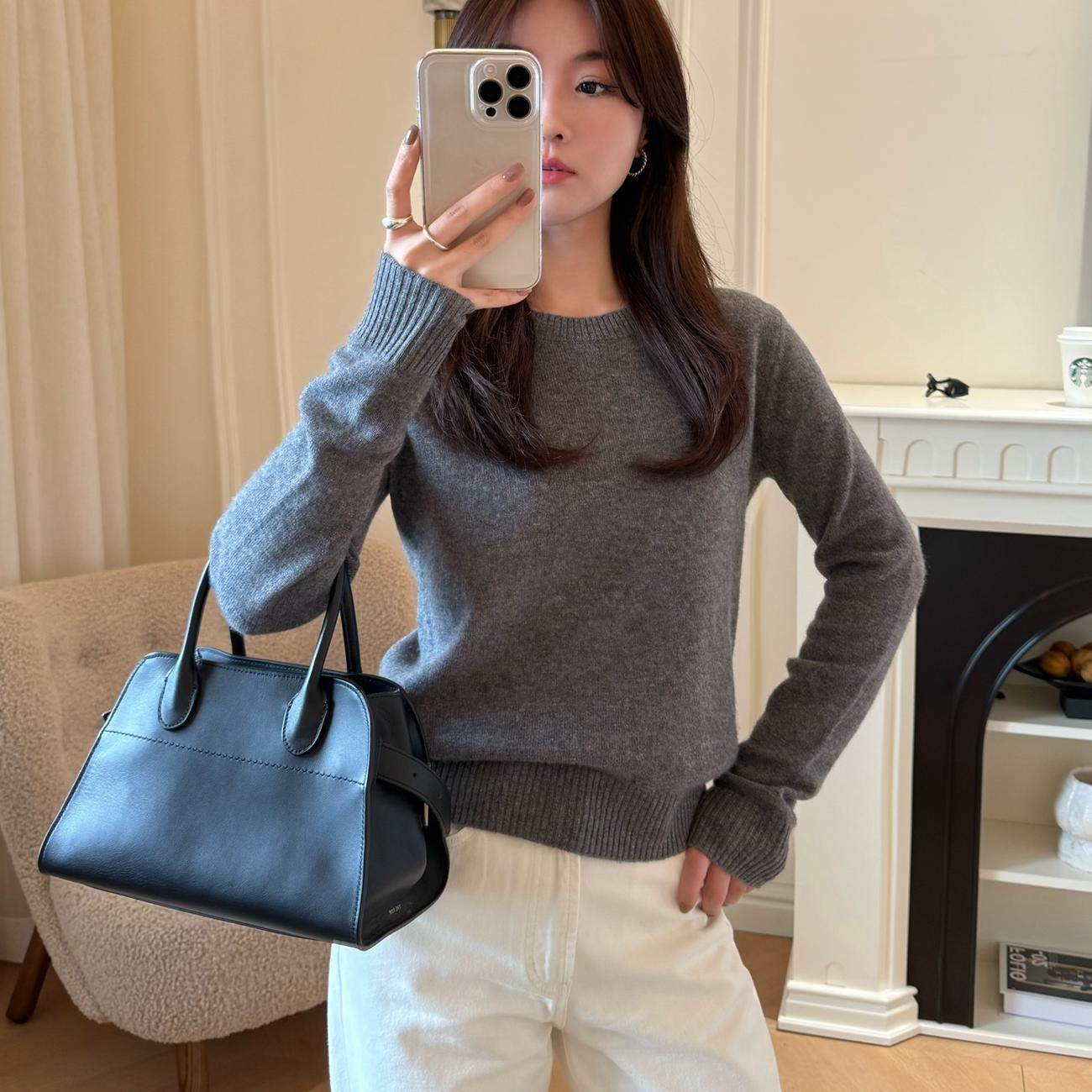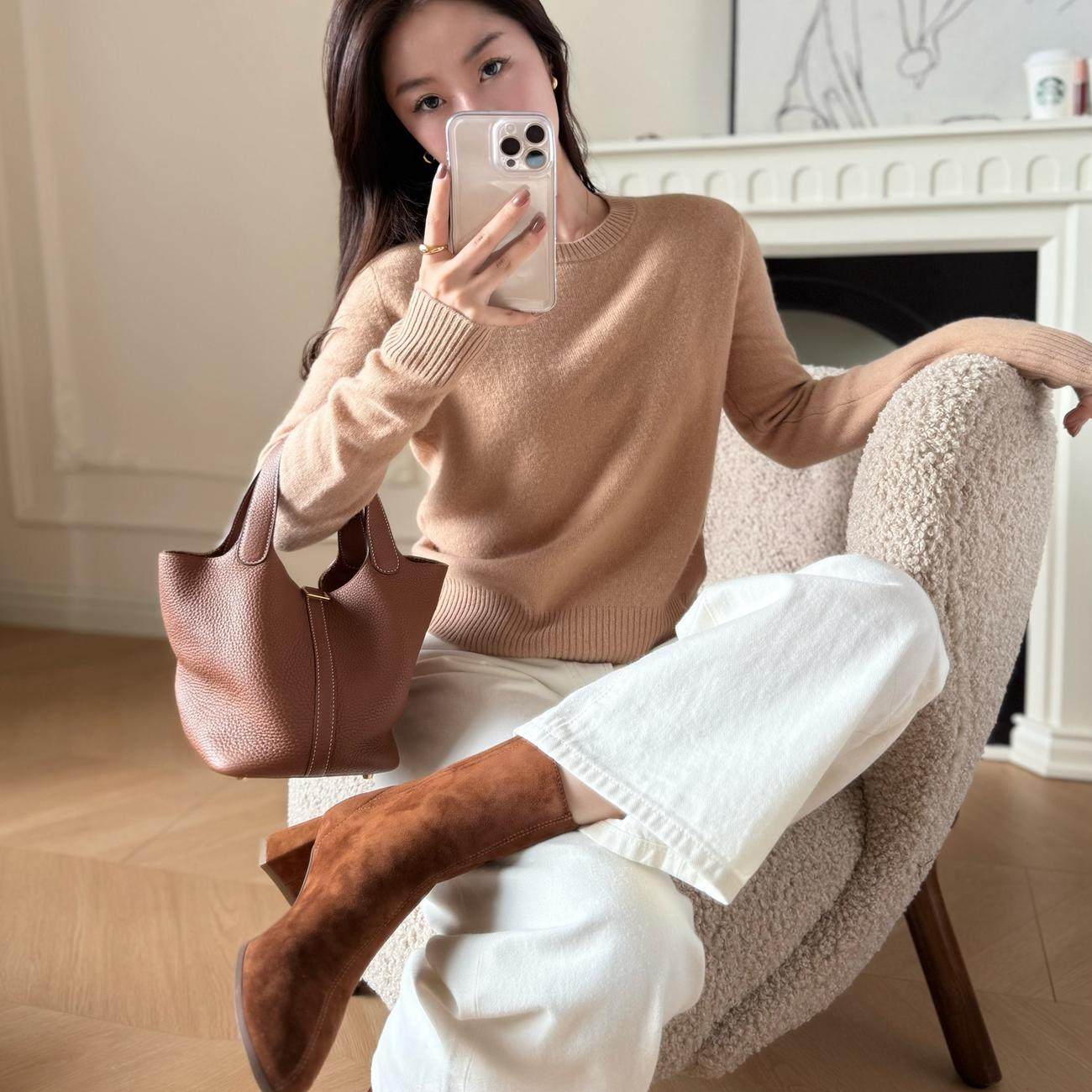 曹大曼 老钱风羊驼毛山羊绒极简圆领毛衣修身显瘦针织打底衫女冬