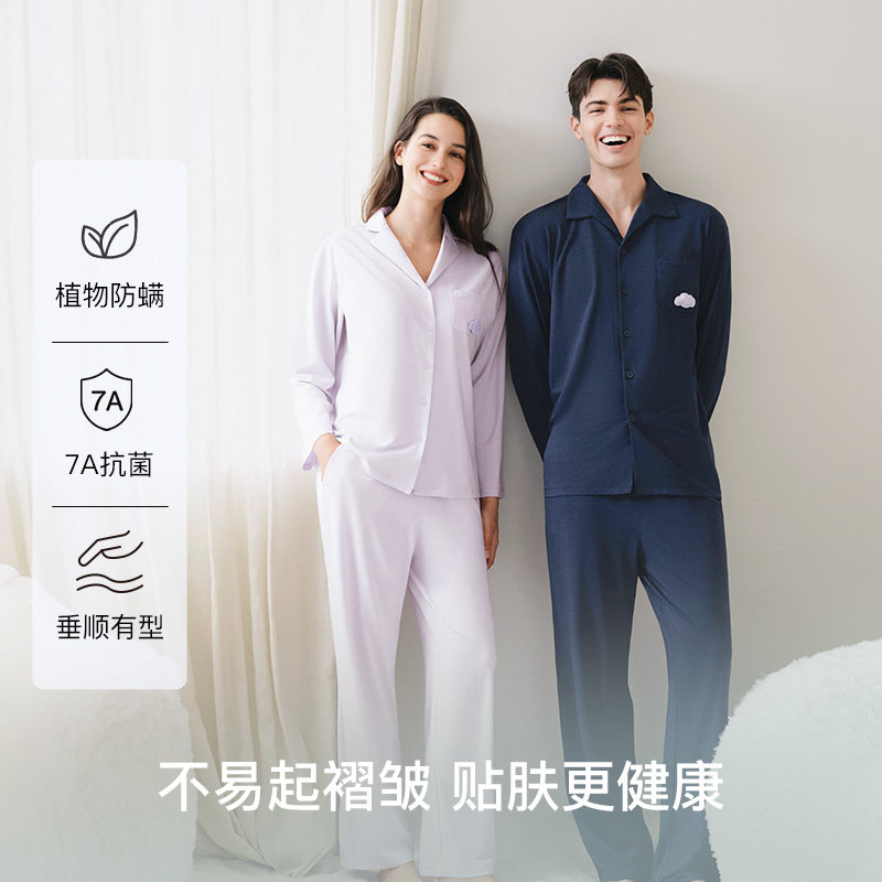 安比斯情侣睡衣舒适纯棉秋季女长袖男女同款休闲家居服套装可出门