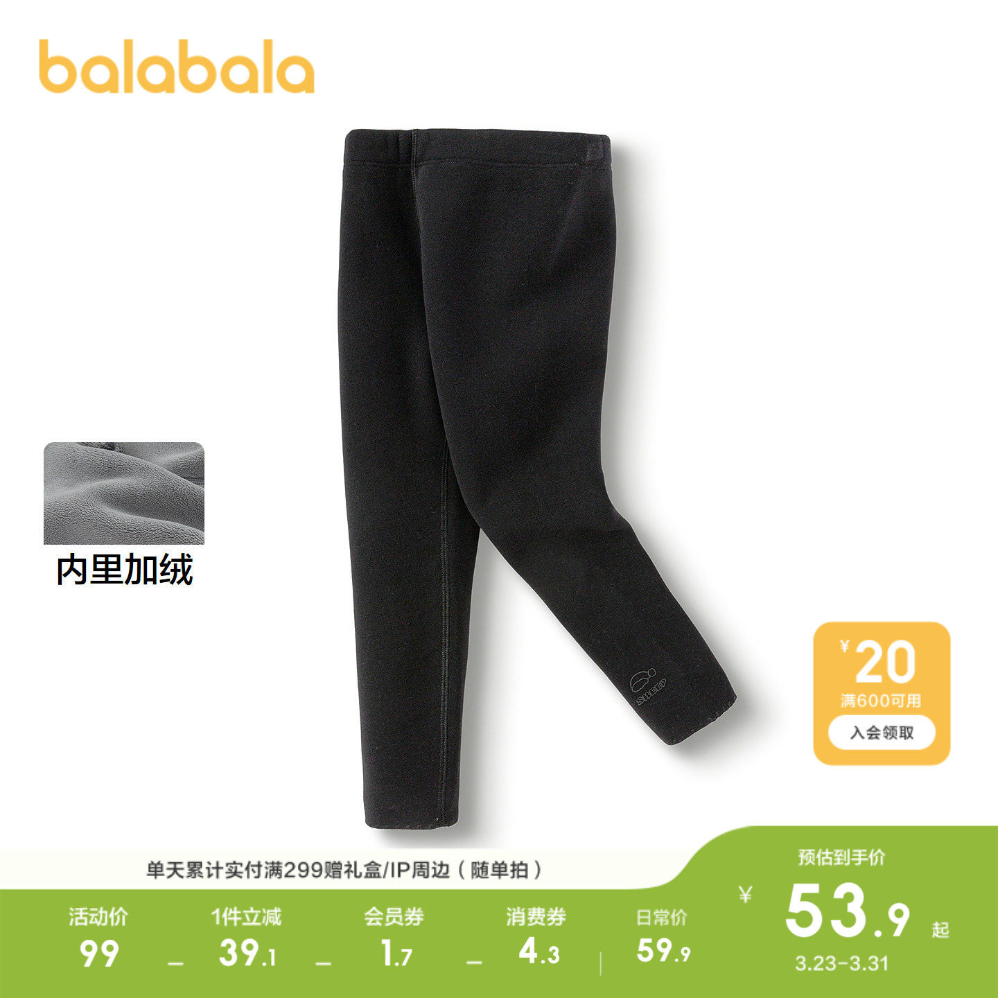 巴拉巴拉童装儿童打底裤加绒保暖女童裤子秋冬长裤时尚百搭休闲裤