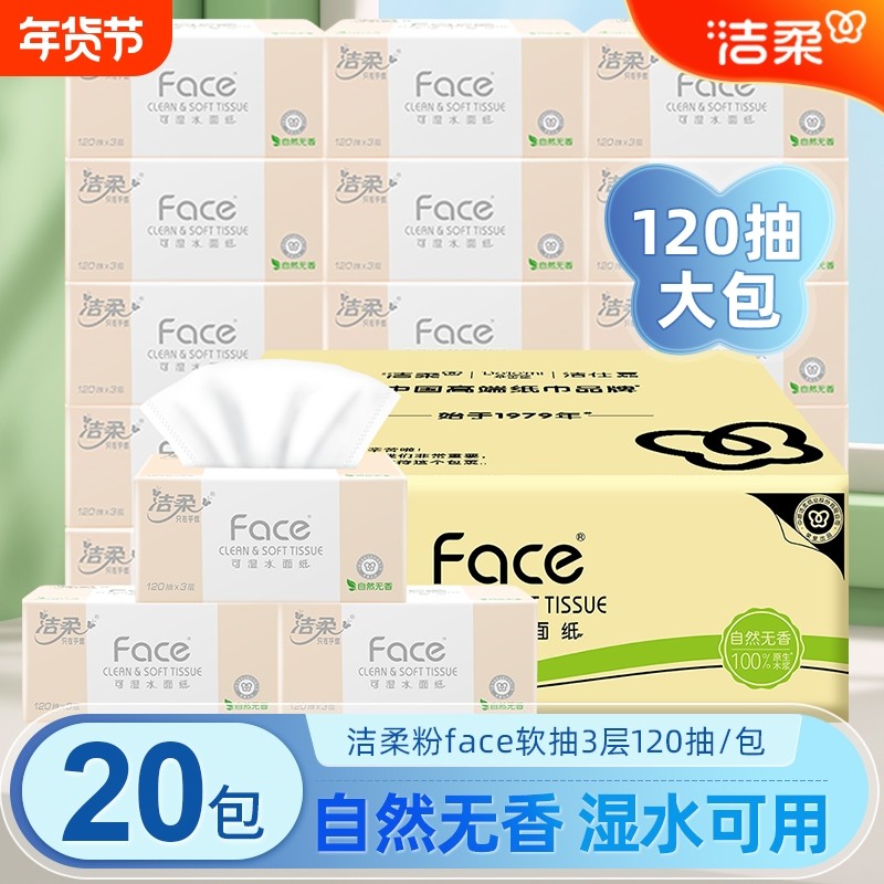 洁柔抽纸120抽3层20包柔韧可湿水家用餐巾纸面巾纸整箱装卫生纸
