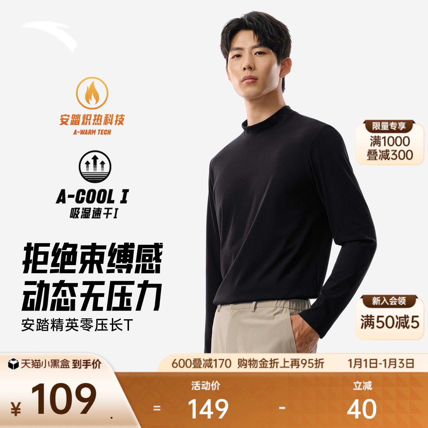 安踏零压T丨加绒半高领长袖t恤男装冬季新款简约风通勤打底衫上衣