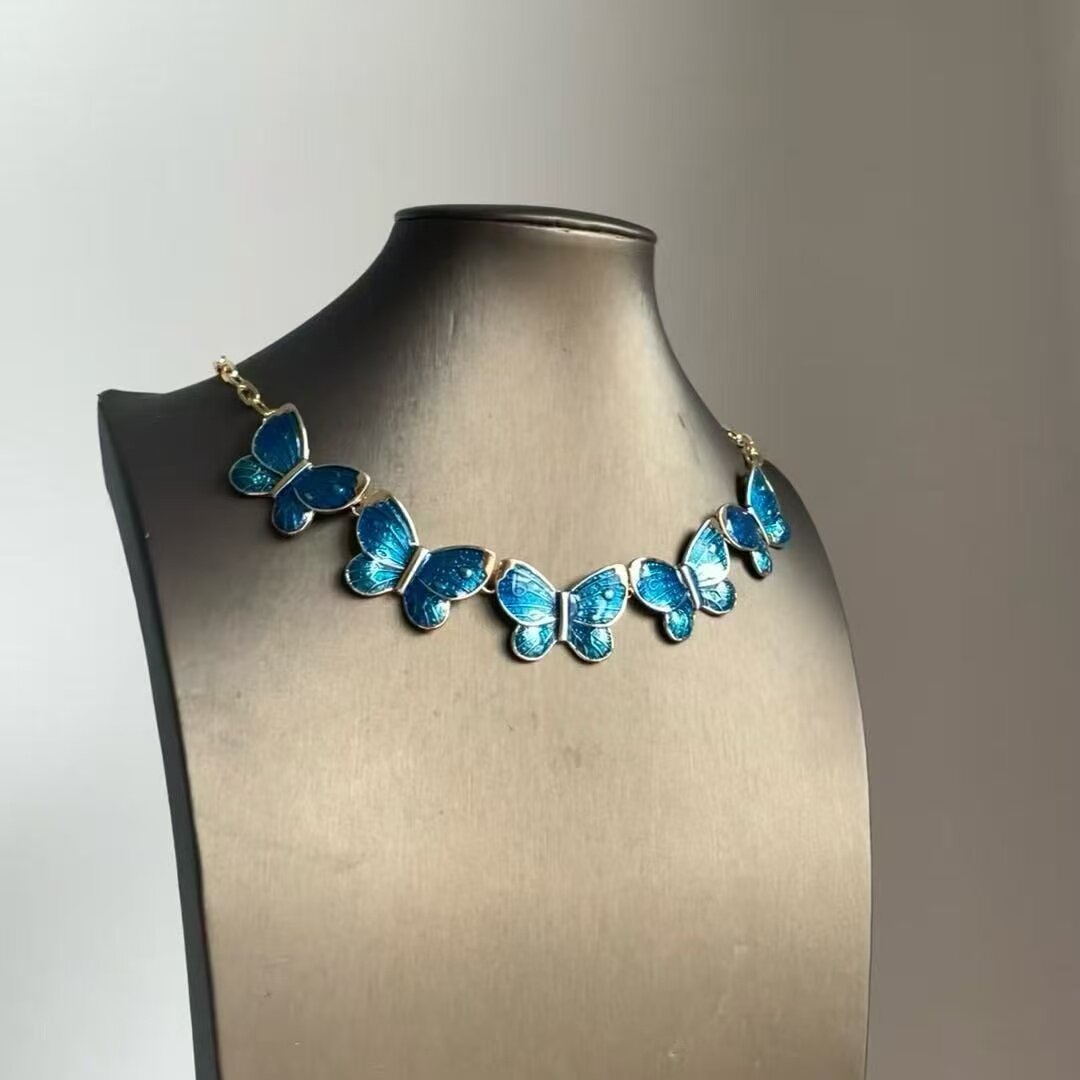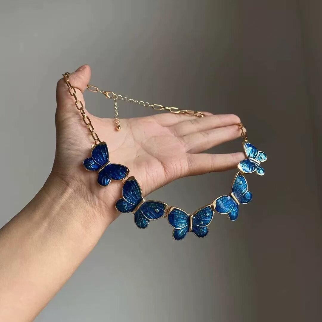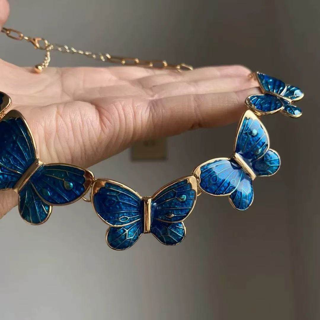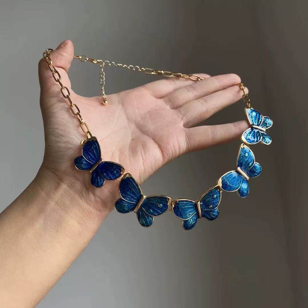 蓝色海洋蝴蝶滴油项链早秋复古高级感锁骨链小众设计礼服配饰颈链
