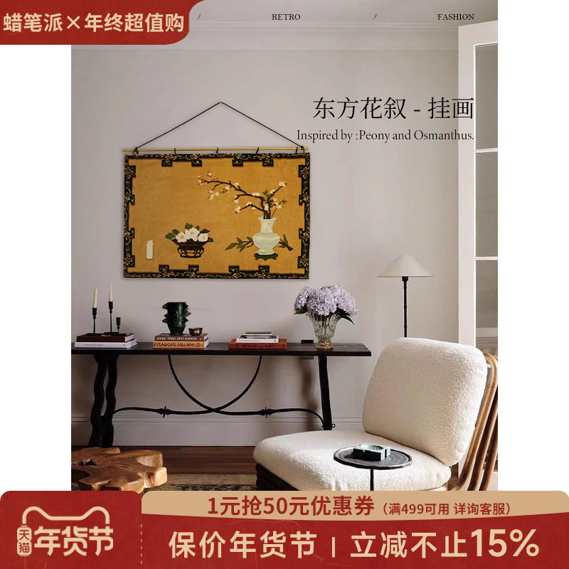 蜡笔派东方花叙挂画新中式古典氛围感铜杆挂毯画客厅背景画装饰画
