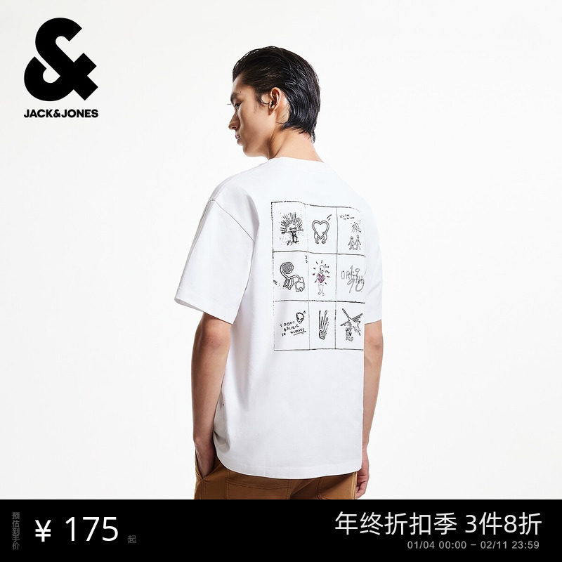 杰克琼斯男装秋季T恤精致刺绣舒适百搭背部趣味图案宽松短袖上衣