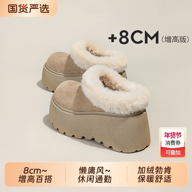 厚底增高8cm包头半拖鞋女2025冬加绒毛口胖头鱼保暖懒人棉鞋大头