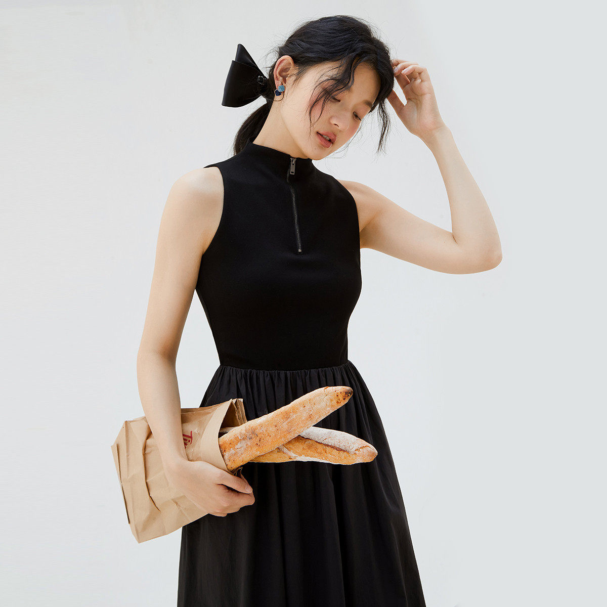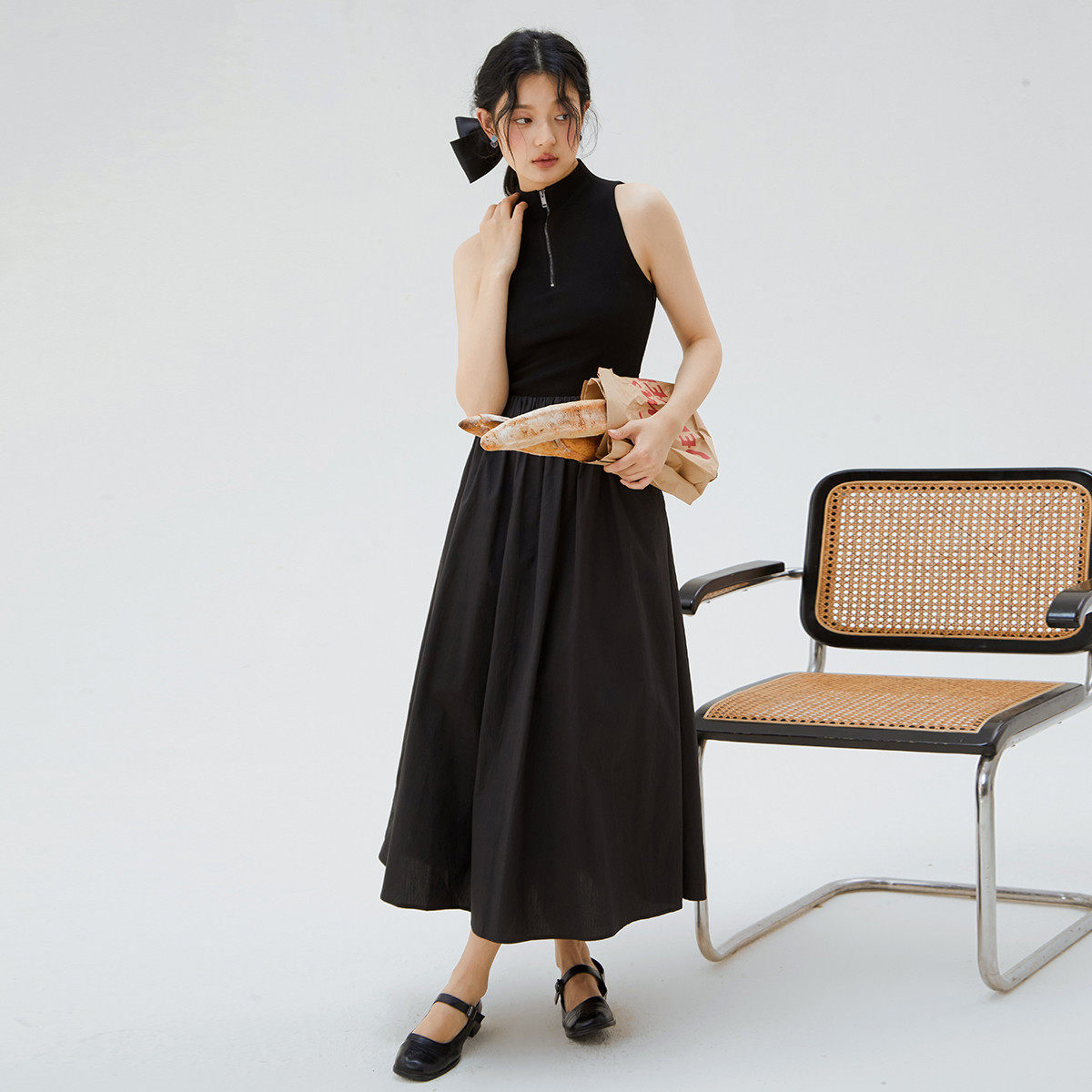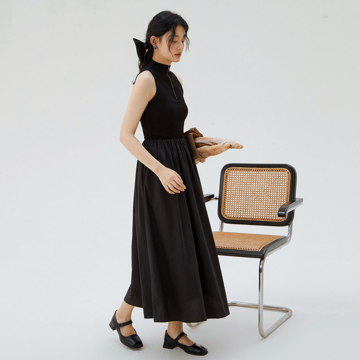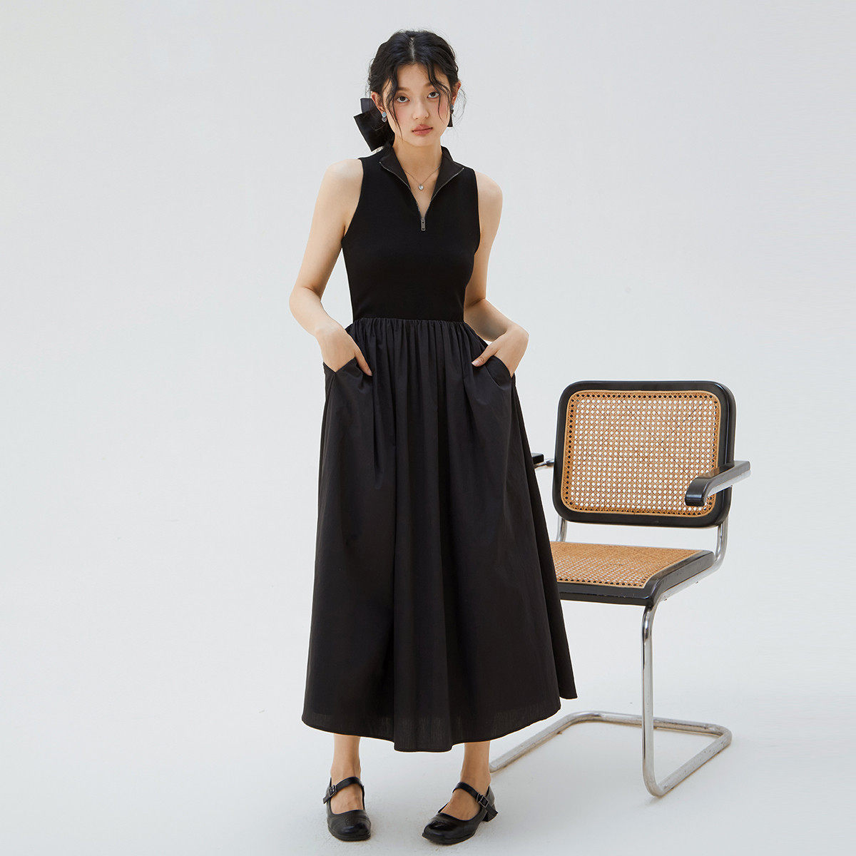 one more2025夏季薄款立领背心裙女士修身拼接连衣裙高级感小黑裙