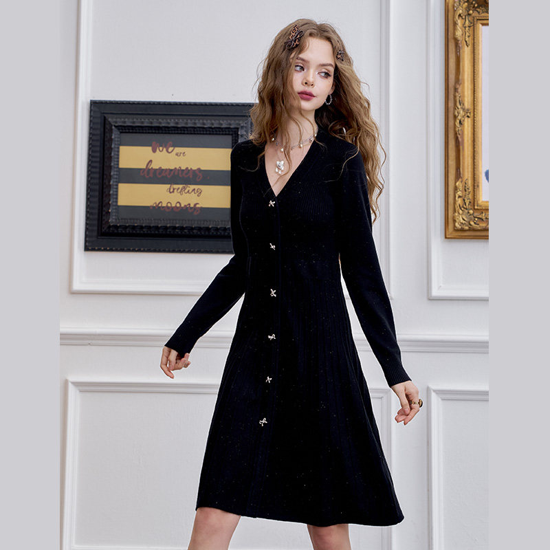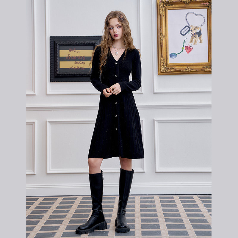 妖精的口袋细闪v领针织连衣裙女2025年秋新款修身小黑裙圣诞穿搭