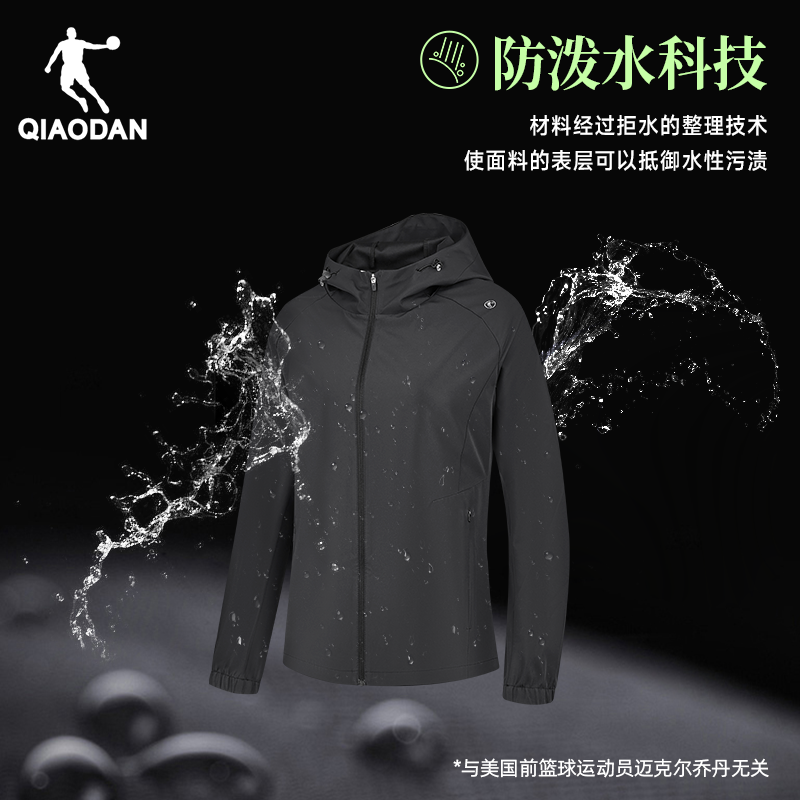 特步防泼水夹克外套男春秋季户外风衣连帽黑色上衣防风运动训练服
