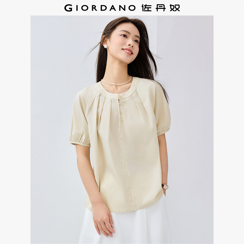 佐丹奴短袖衬衫女纯棉府绸优雅风压褶圆领半开襟气质小衫13345308