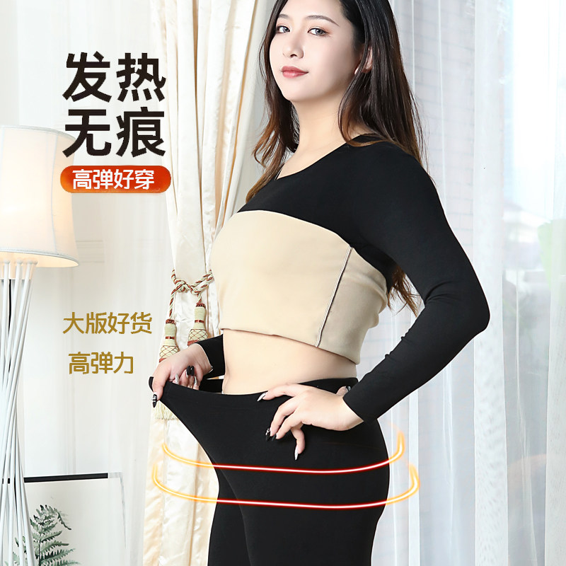 荭豆保暖衣女套装加肥加大码无痕发热一体德暖绒女秋衣秋裤胖MM冬