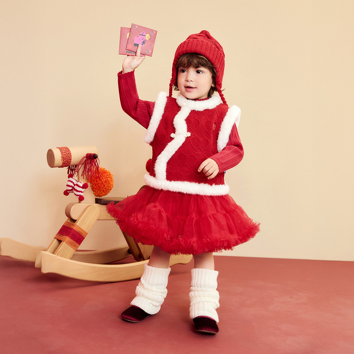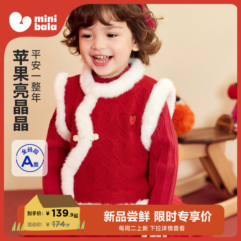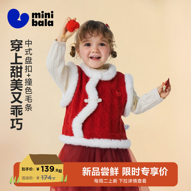 迷你巴拉巴拉女童宝宝马甲背心柔软保暖新年红色新中式盘扣拜年服