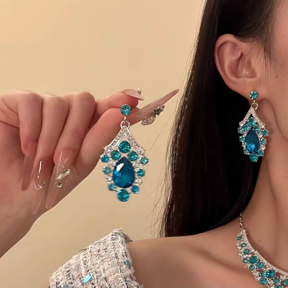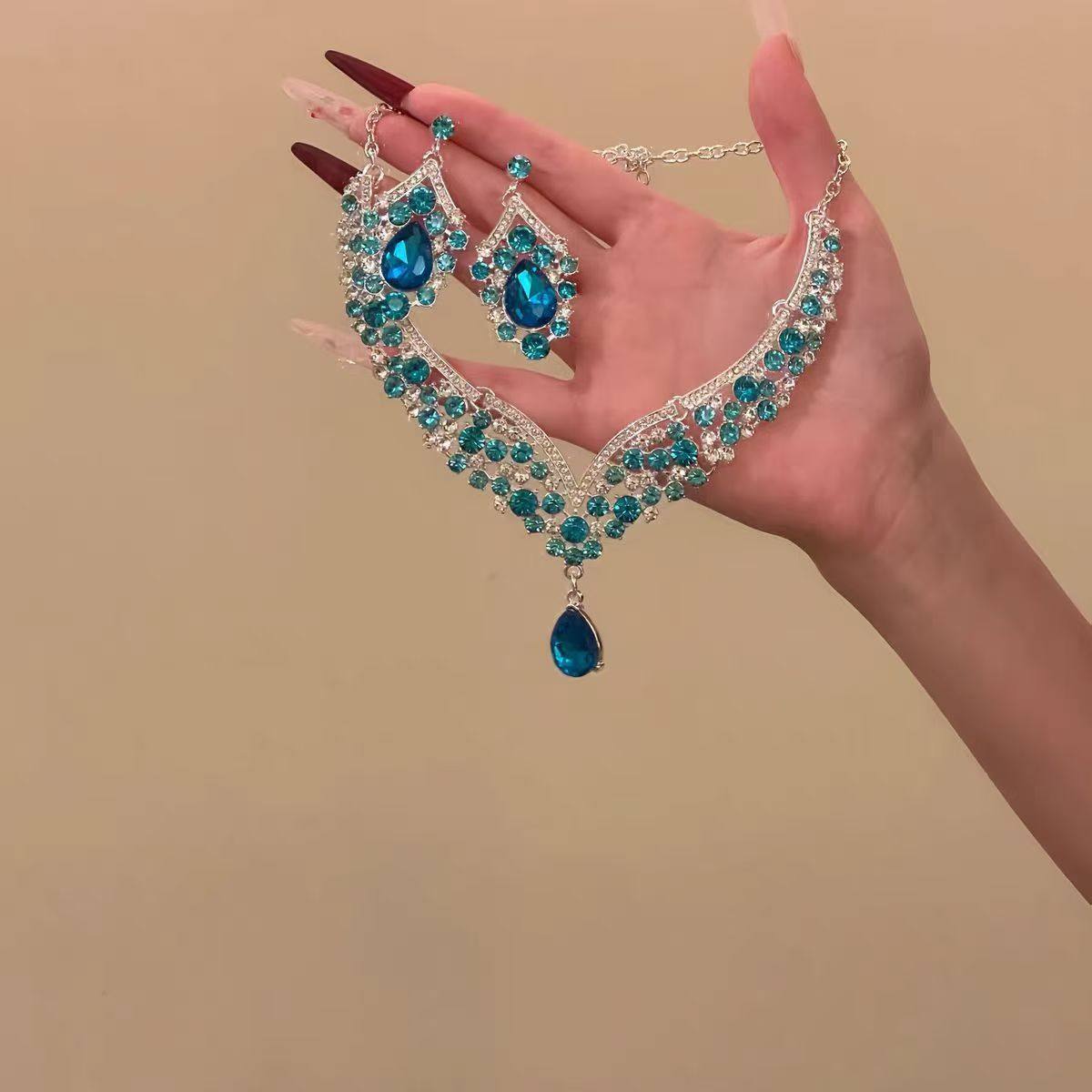 超闪夸张蓝色水滴锆石项链婚纱礼服晚宴配饰耳环套装轻奢锁骨颈链