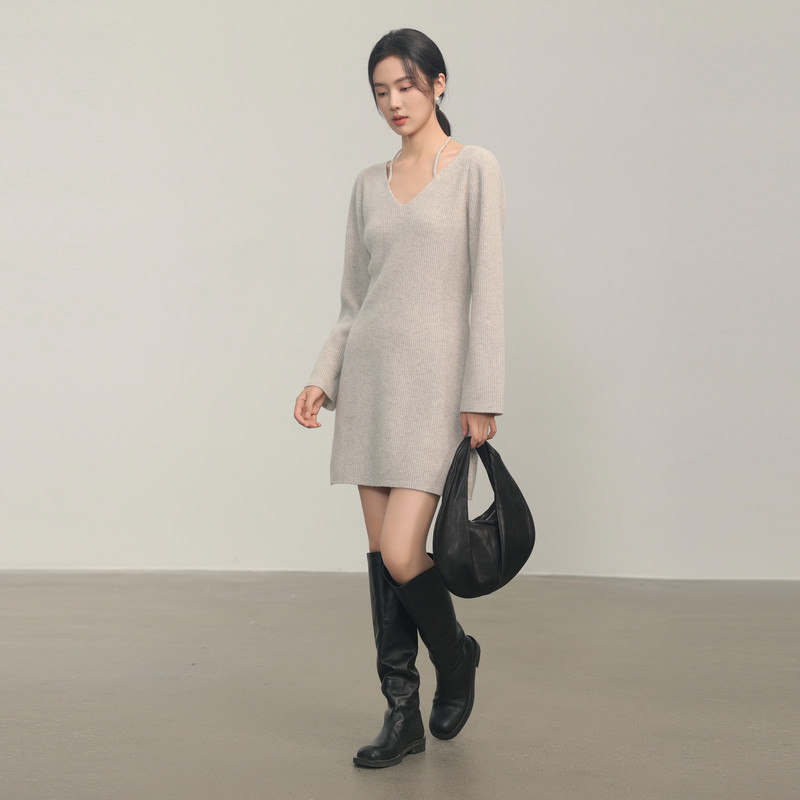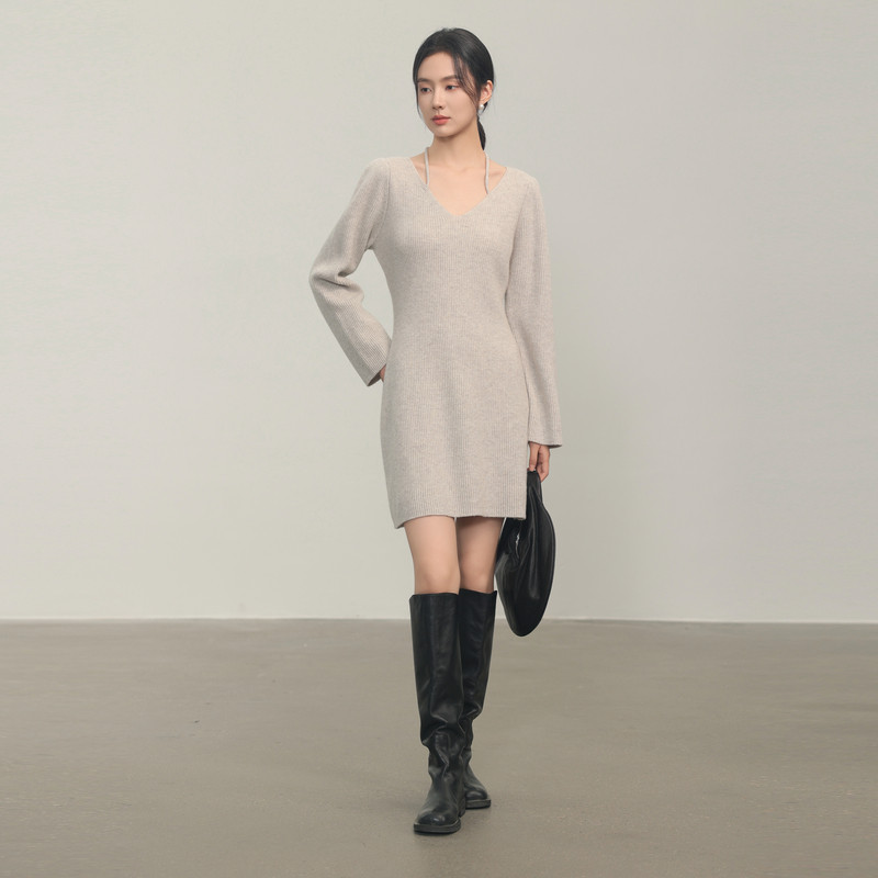 AIRIQI冬季新款性感v领修身内搭收腰包臀羊毛针织连衣裙AH44LQ267