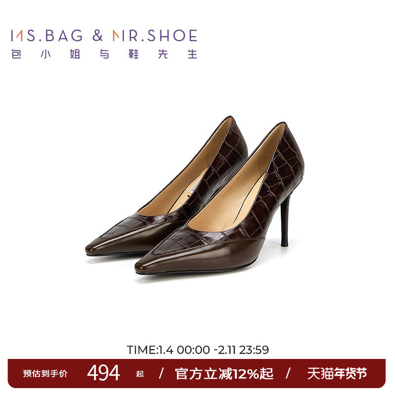 包小姐与鞋先生2025年春季新品双色压纹牛皮浅口细跟单鞋女251037