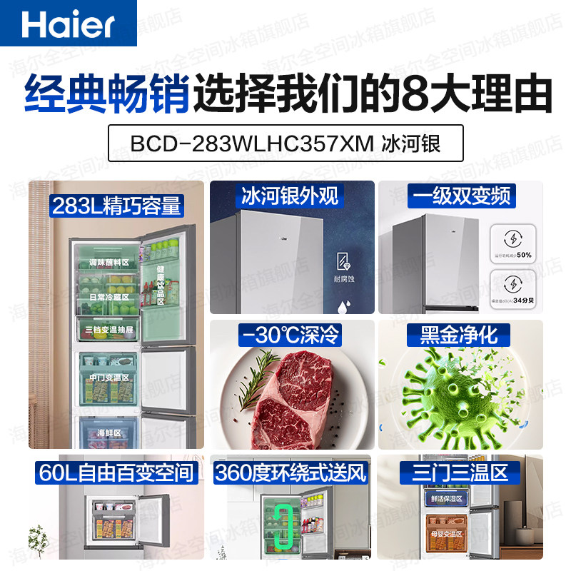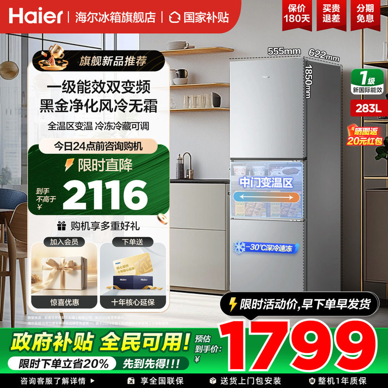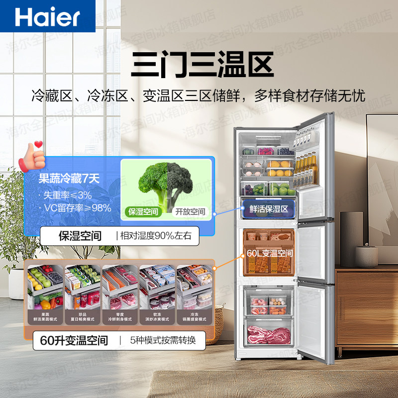 海尔冰箱283升三开门一级能效风冷无霜变频节能小型家用官方正品