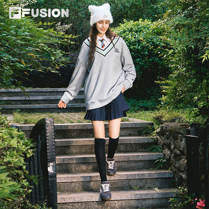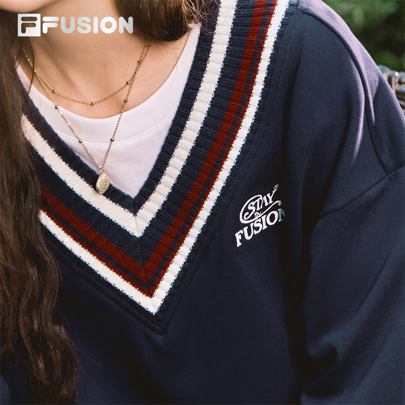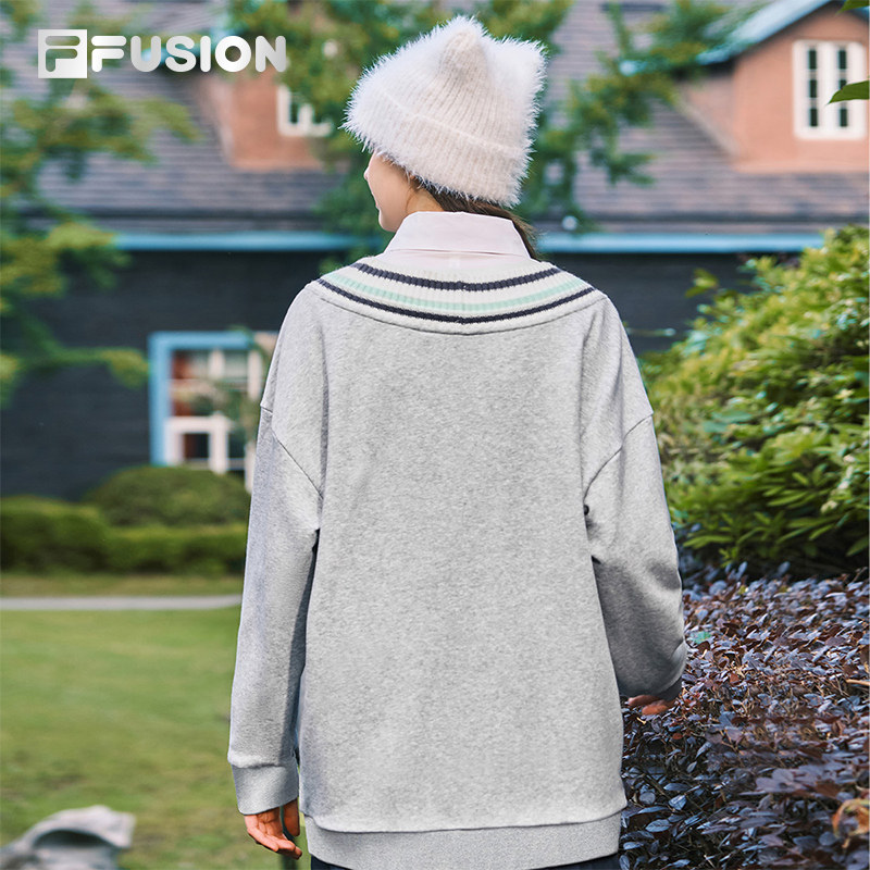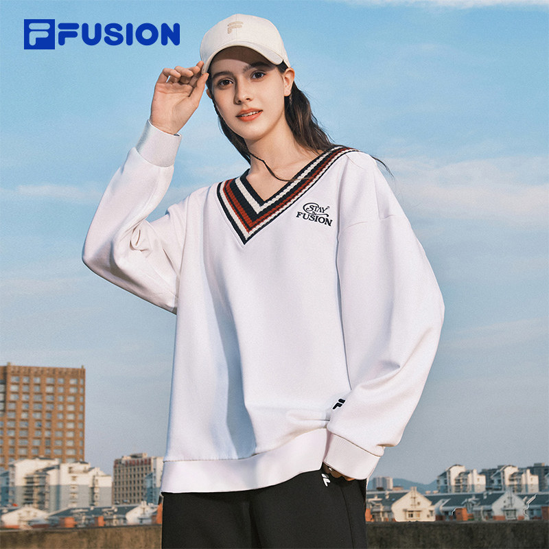 FILA FUSION斐乐潮牌女子套头卫衣2025秋新款时尚拼接V领针织上衣