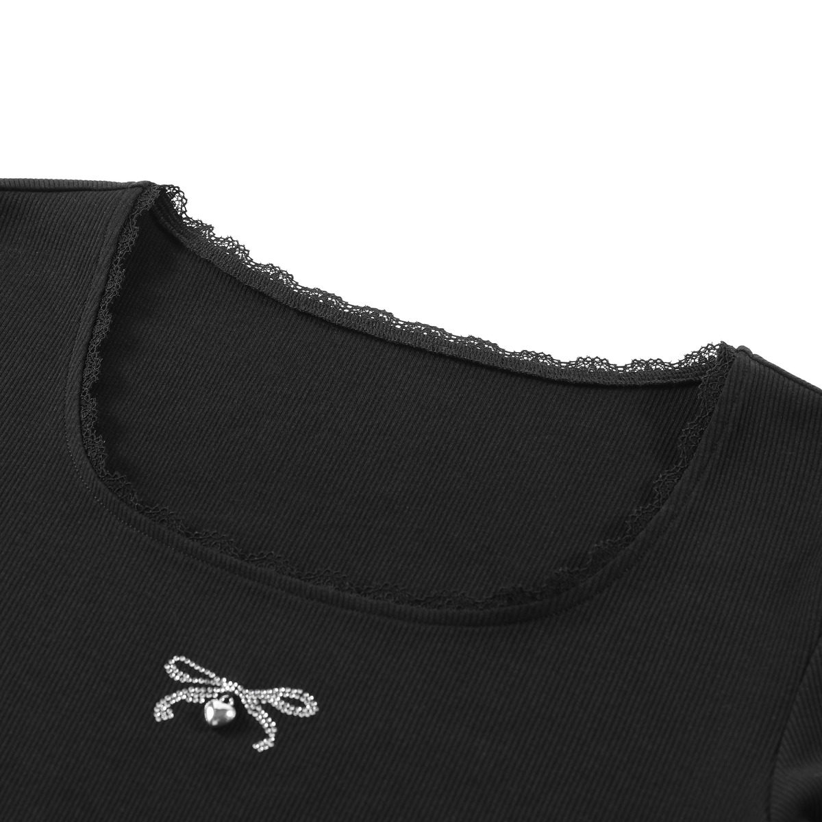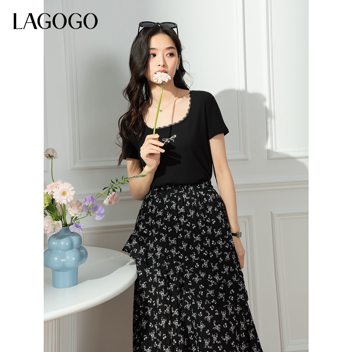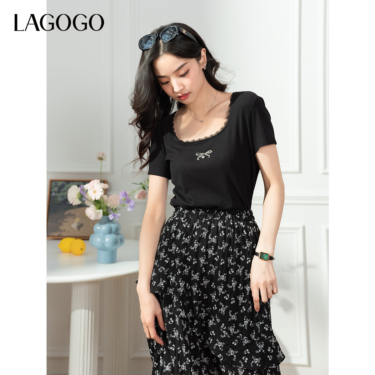 【优可丝】LAGOGO黑色蕾丝修身T恤女拉谷谷夏季新款短袖上衣
