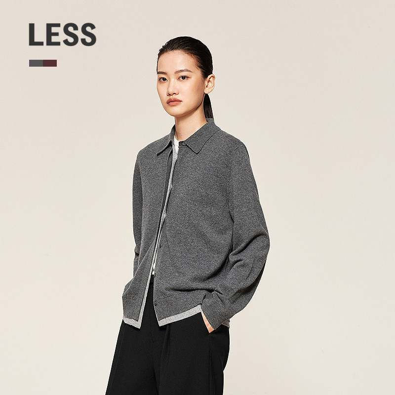 LESS春秋polo领针织衫女假两件休闲长袖短款开襟羊绒衫2O9314800