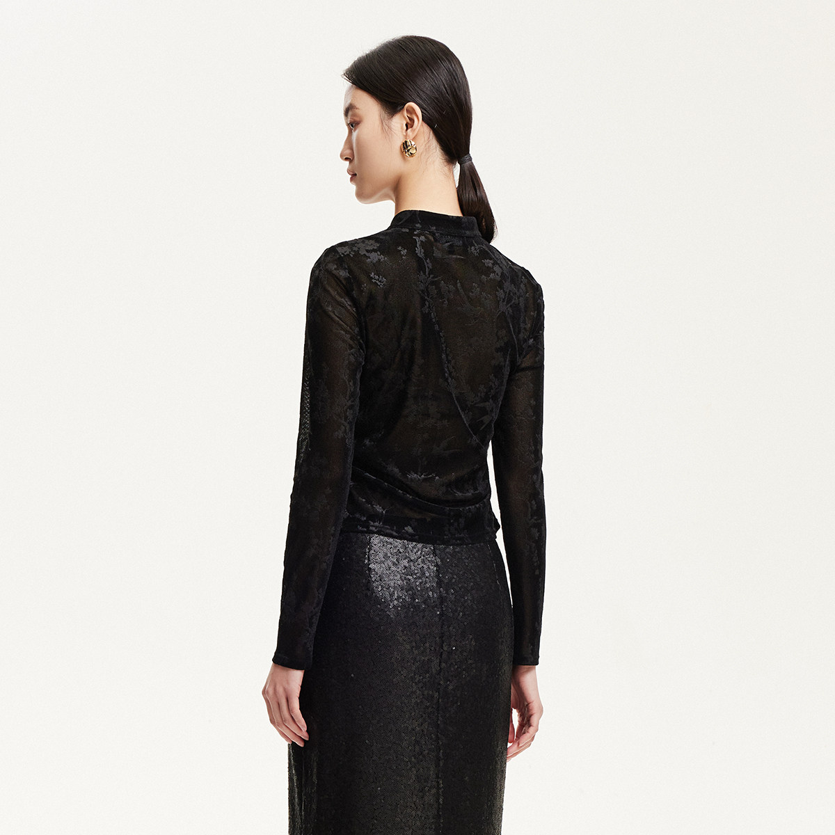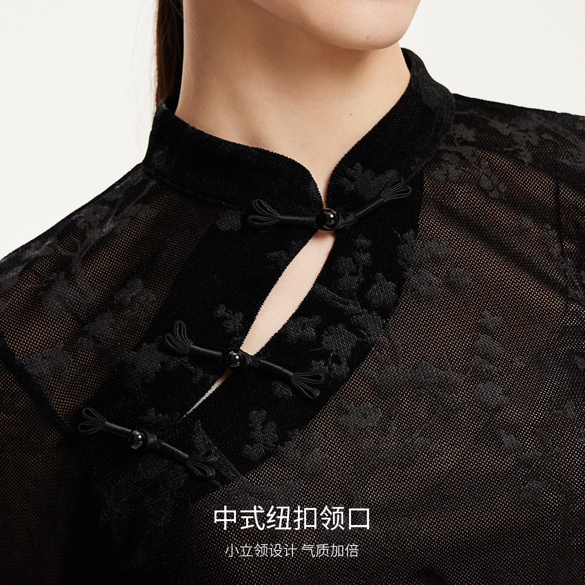 Vero ModaT恤2025夏季新款新中式植绒暗纹镂空盘扣T恤325102018