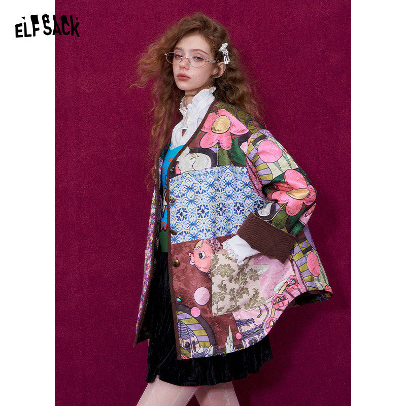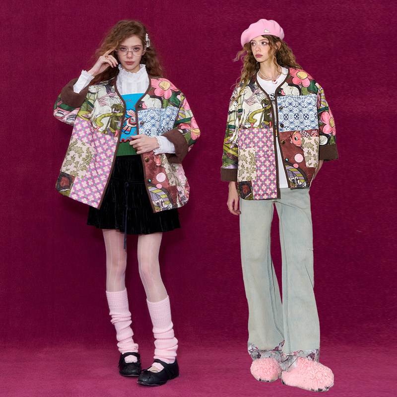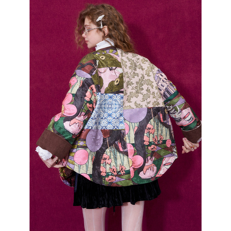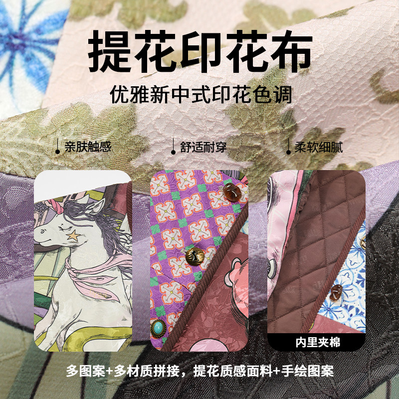 妖精的口袋新中式提花拼接夹棉短外套女2026春新款新年战袍厚外套