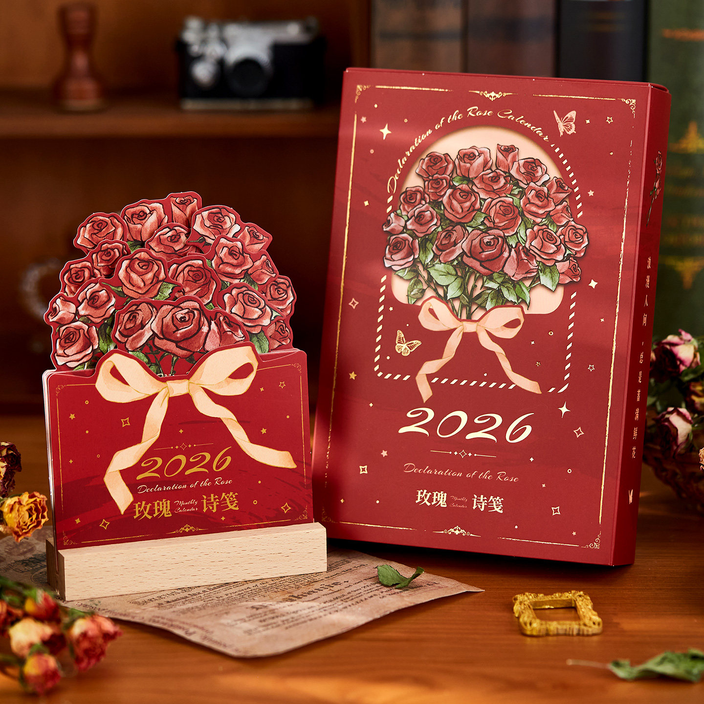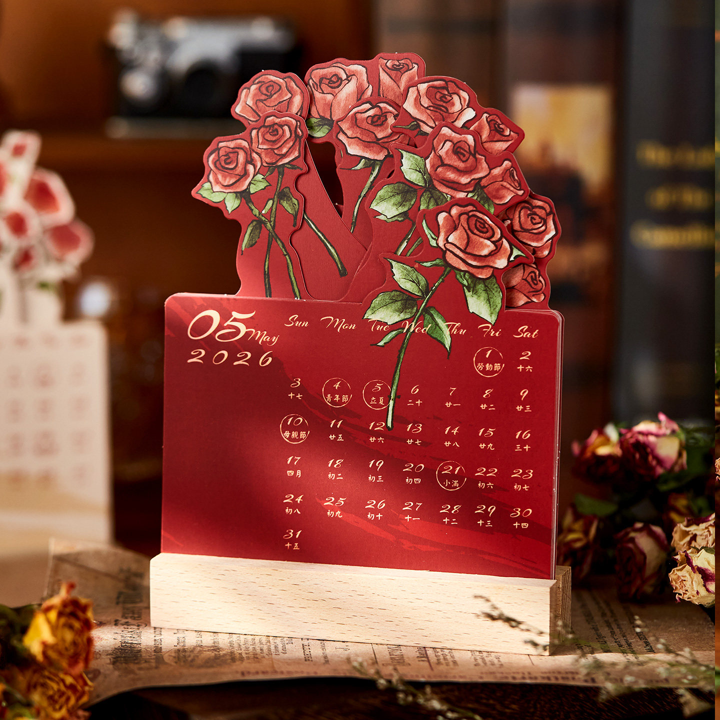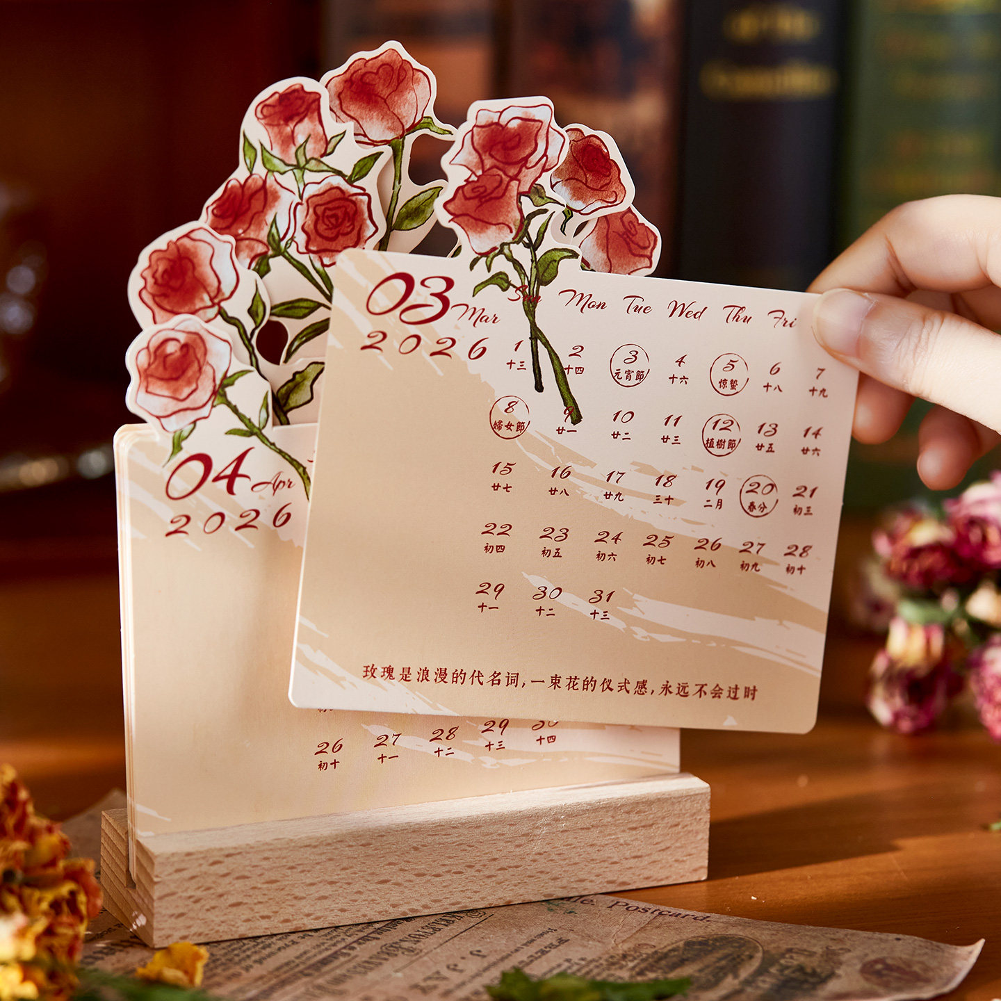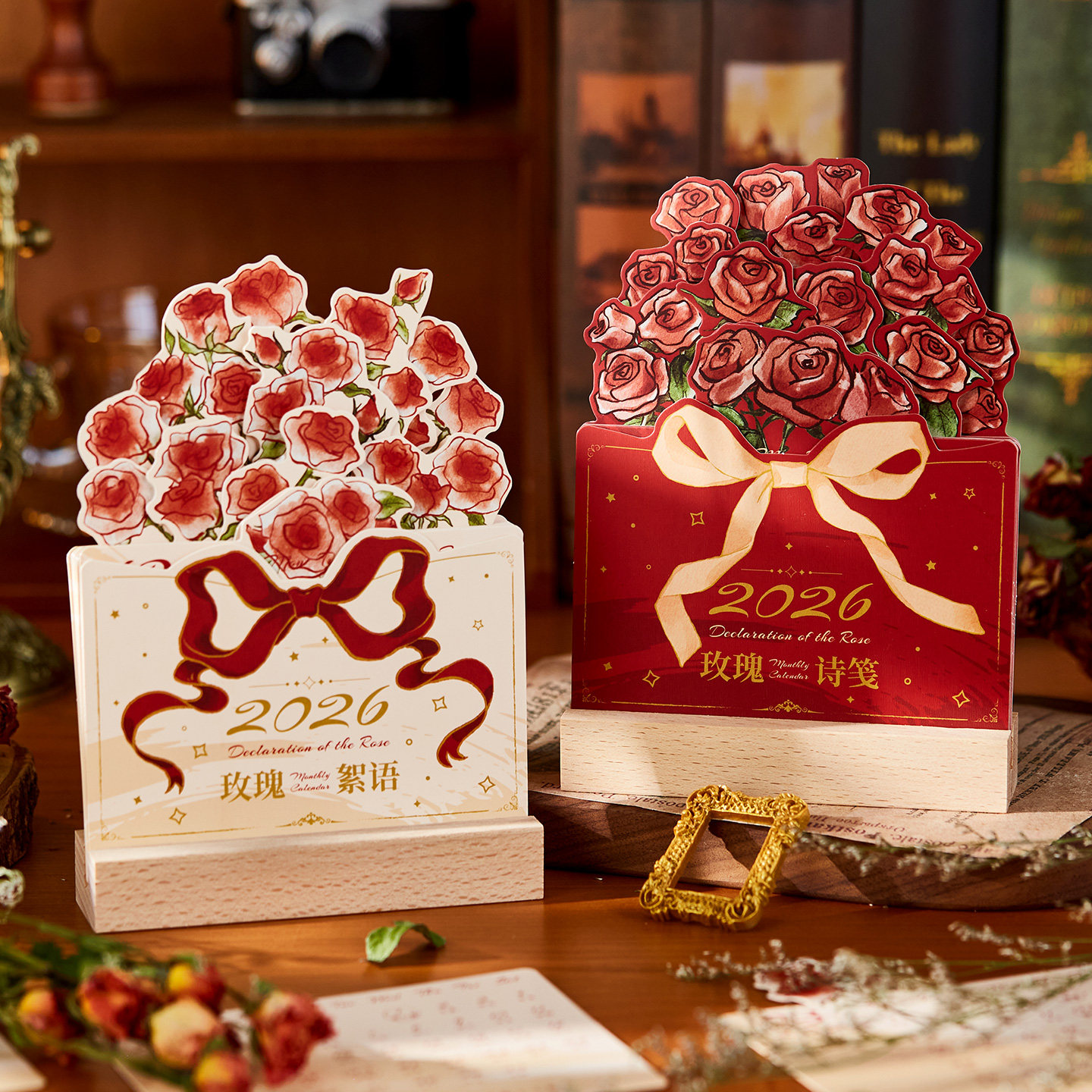 2026玫瑰立体台历浪漫木质桌面日历摆件创意礼物伴手礼月历浪漫