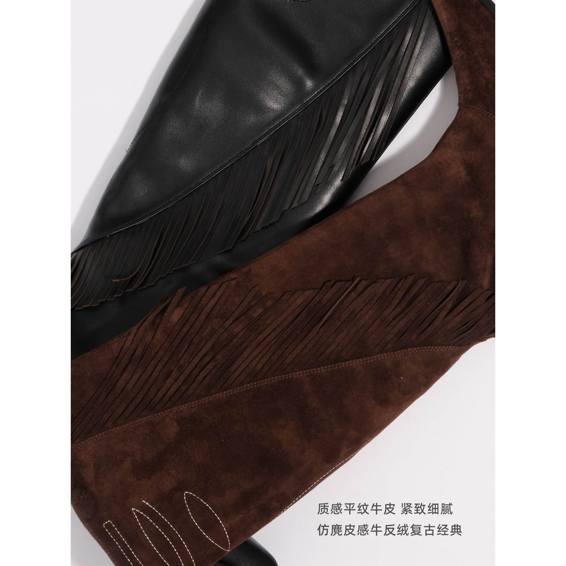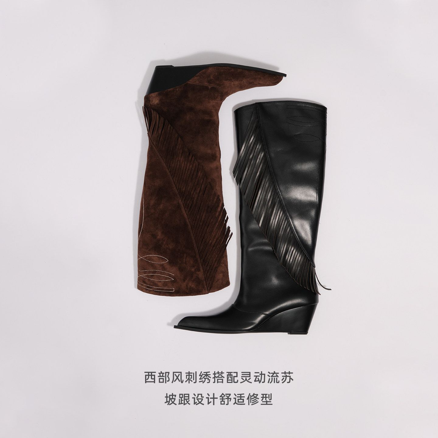 尖头坡跟显瘦长靴 不对称皮革流苏灵动时髦