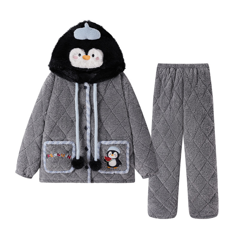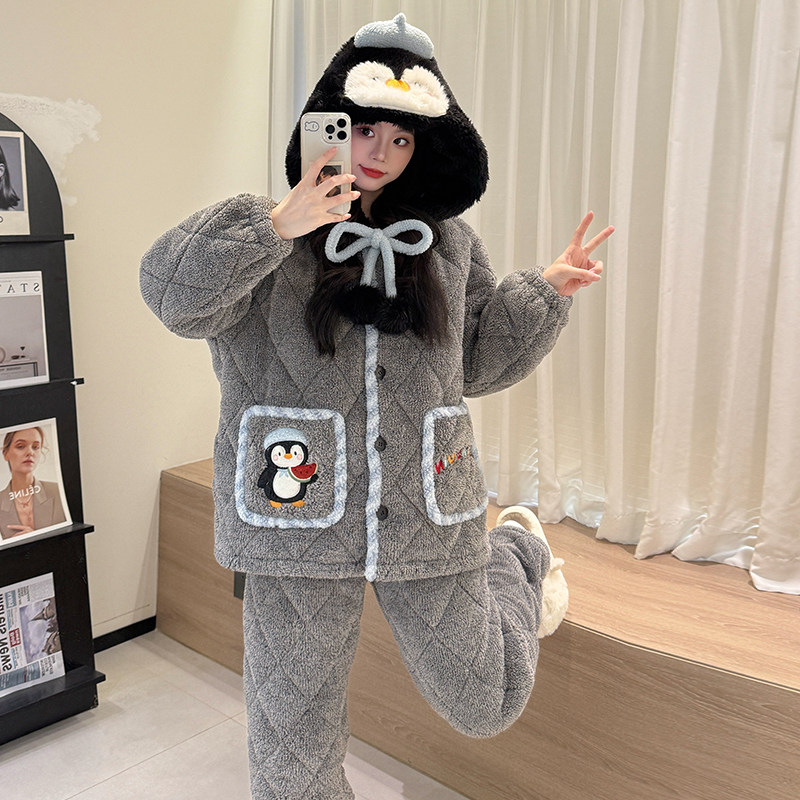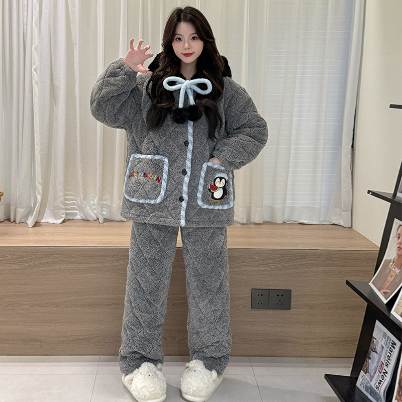 睡衣女款冬季三层夹棉珊瑚绒加厚加绒家居服女士大码棉袄保暖套装