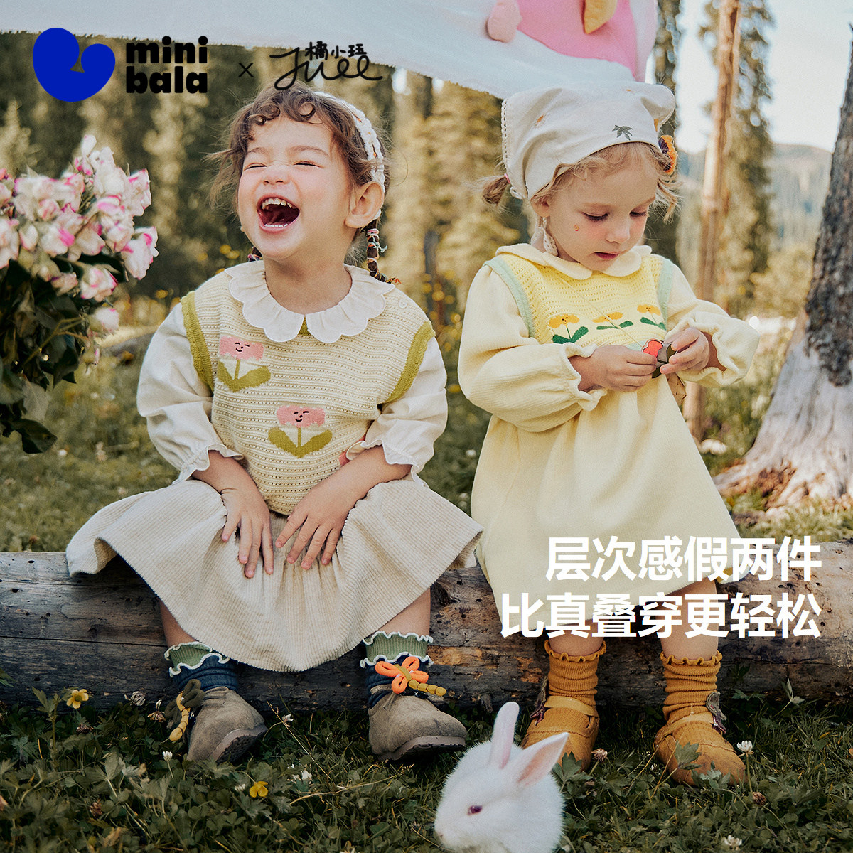 迷你巴拉巴拉女童连衣裙假两件春新宝宝毛衫拼接甜美花边裙子